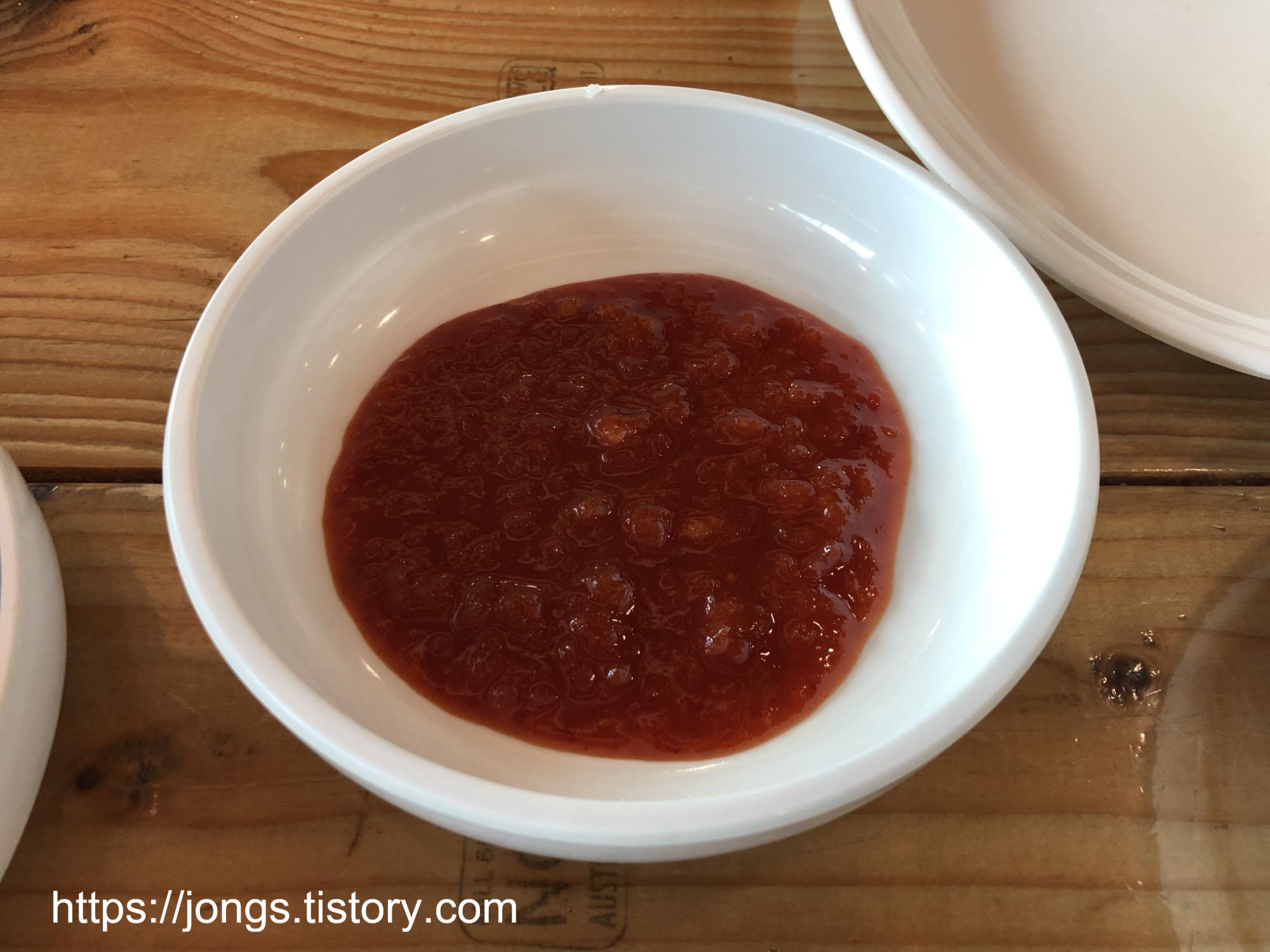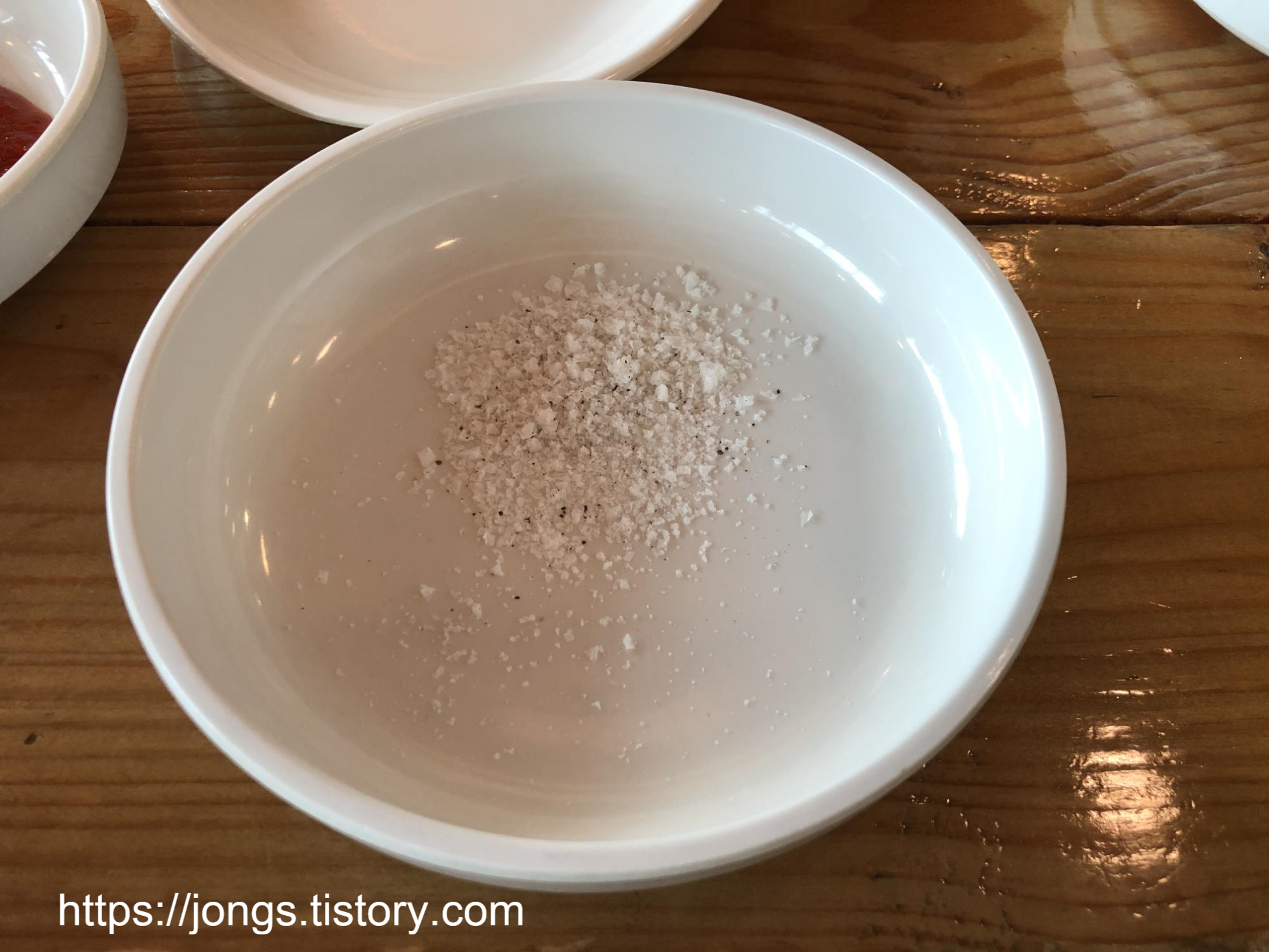 기본으로 나오는 깍뚜기모양 무절임, 양소스, 소금, 김치입니다. 셀프로 가지고 와서 먹을 수 있는 온육수도 있습니다.