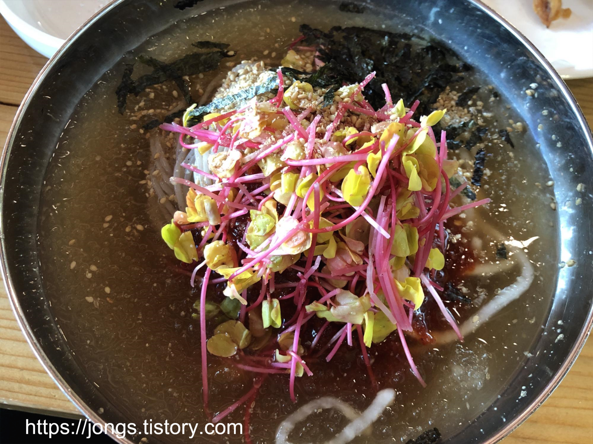 우리가 주문한 메뉴는 ‘메밀막국수’ 2개, ‘메밀후라이드치킨 한마리’에 음료수 ‘미란다’입니다. 막국수에 사리 리필이 가능한데(사리 무한리필) 주문할 때 곱배기처럼 넣을 수도 있고 따로 받을 수 도 있으며 주문시 미리 사리 주문도 함께해도 되고 나중에 해도 됩니다. 보통 주문하면서 사리를 함께 주문하는 것 같았고 개인적으로는 먹는양이 적어서 주문한 막국수만으로도 충분했다고 생각되고 사리까지 먹으니 양이 많은 듯 했습니다.