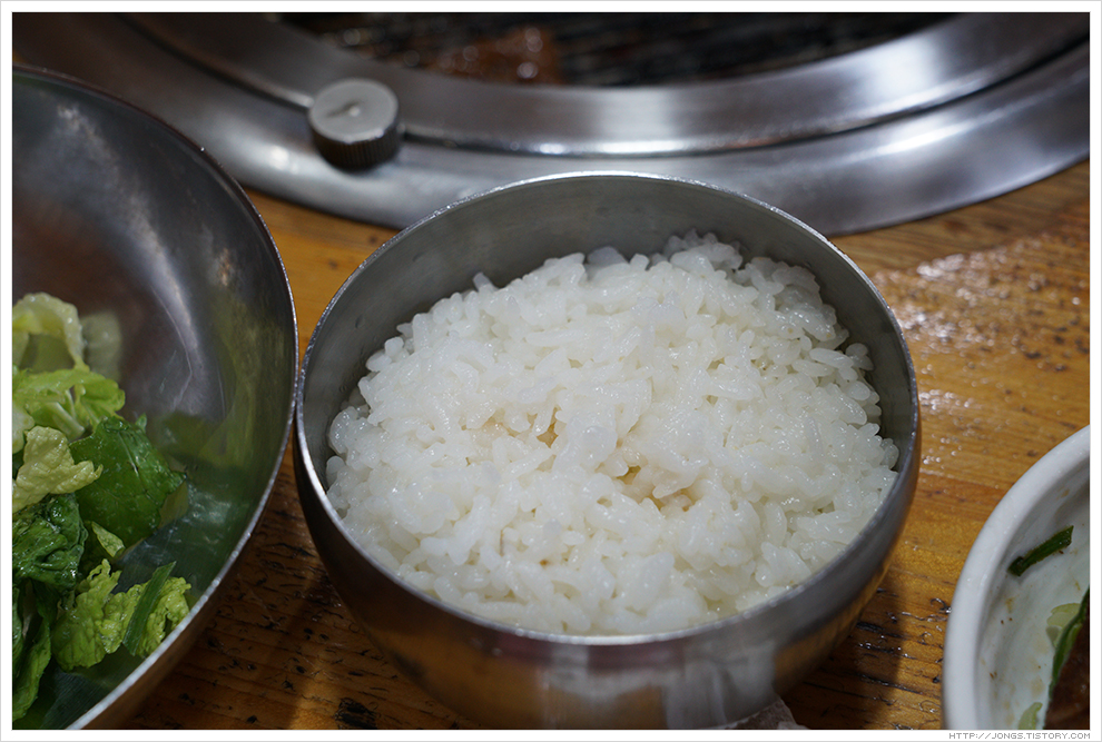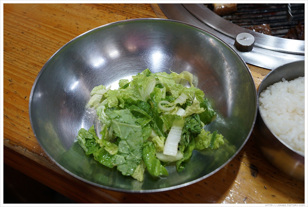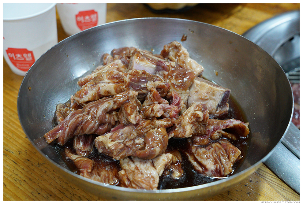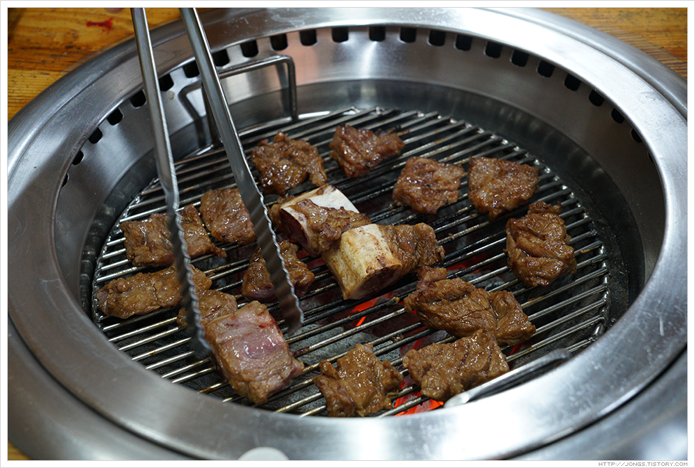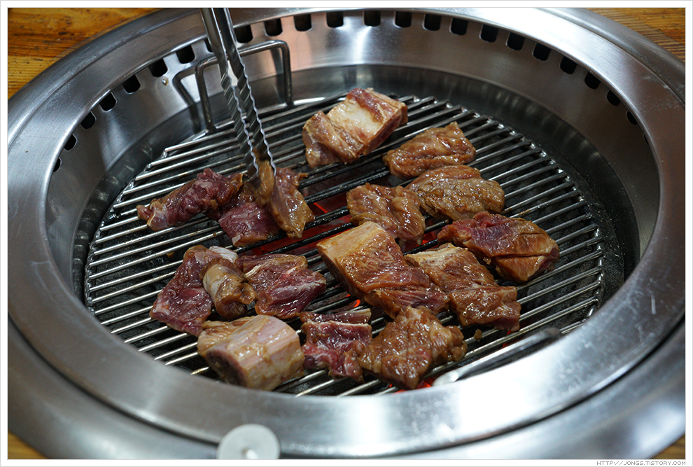그런데 이 간장 소스가 다른 갈빗집에서 먹어 보지 못한 독특한 맛과 향을 선사합니다. 조선간장의 짭쪼롬하고 탁 쏘는 듯한 맛이 고기의 풍미와 더해져 독특함을 주는데, 이것이 무엇이지...???라는 물음표 속에서 계속 고기를 먹었습니다. 처음 접하는 맛과 향이라 표현은 잘 못하겠지만 개인적으로 나쁘지 않고 좋았습니다.