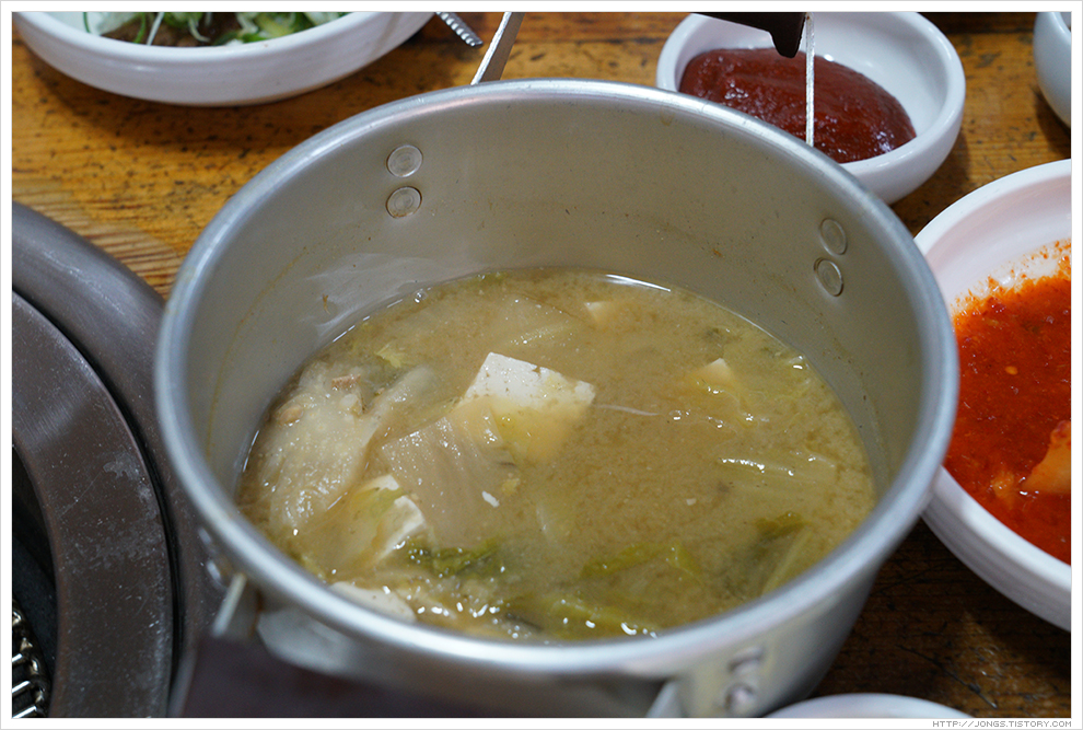 ▼ 공깃밥을 주문하고 함께 나오는 시래기 된장국입니다. 간장소스와 함께 신의 한 수로 느껴졌습니다. 고소한데 밥에 비셔서 먹으면 고기와 정말 잘 어우러지고 맛과 향이 확실한데 강하지 않고 갈비와 잘 어우러질 정도의 만들어서 기분 좋게 식사를 끝낼 수 있도록 해 주었습니다. 입맛을 돋우는데 일등공신입니다.