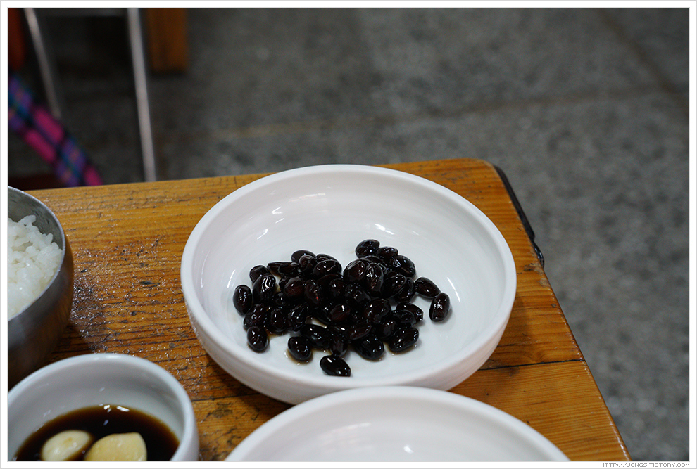 ▼ 공깃밥과 함께 나오는 반찬인데 입맛을 돋아 주고 맛깔납니다. 깻잎절임, 검정 콩자반, 콩나물무침, 고추장 소스 나옵니다.