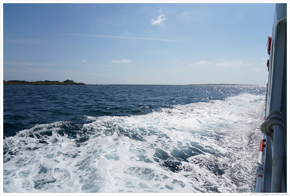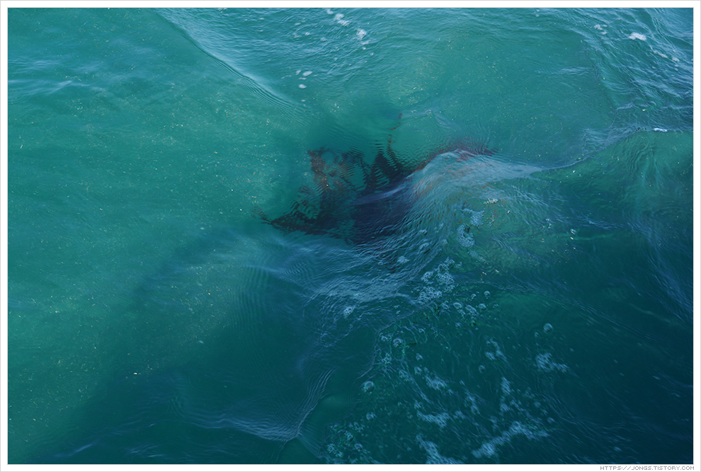▼ 배 뒤에서 가파도 바다를 보니 사금처럼 반짝반짝이는 것이 보였습니다. 배 스크류 물살에 아래쪽에 있는 모래가 뒤집히면서 그런 것 같은데 햇빛을 받으니 사금 같아 보이네요.