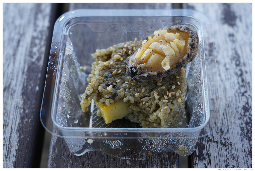 ▼ 마라도가 보이는 위 사진에서 왼쪽 아래 벤치가 있습니다. 이 벤치에서 점심을 먹기로 결정했습니다. 오늘 점심은 아침에 '제주 김만복 김밥'에서 구입한 '통전복 주먹밥'입니다. 위쪽에 조그마한 전복이 통으로 올라가 있고 '만복이네 김밥'의 밥 처럼 전복 양념이 되어 둥근 형태로 모양을 만들었습니다. 그 안에 김밥과 같이 네모난 계란이 들어가 있습니다. 일반인에게는 양이 적어 보이고 양이 적은 제게는 딱 맞는 점심이었습니다.