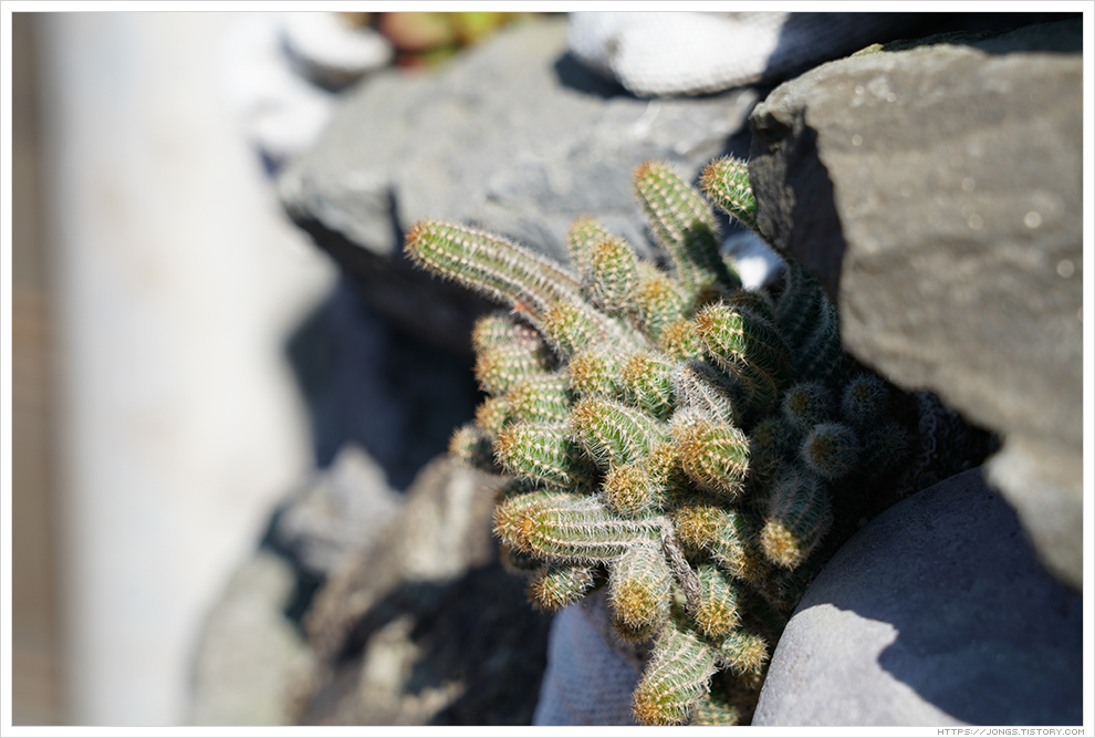 ▼ 담장으로 쌓은 돌에 뿔소라 껍질을 붙여 놓았습니다. 그 사이사이에 다육이와 선인장 처럼 보이는 식물도 심어 놓았습니다. 이렇게 꾸며 놓은 돌담은 사람들의 걸음을 멈추게 하고 입가에 웃음을 만들어 줍니다.