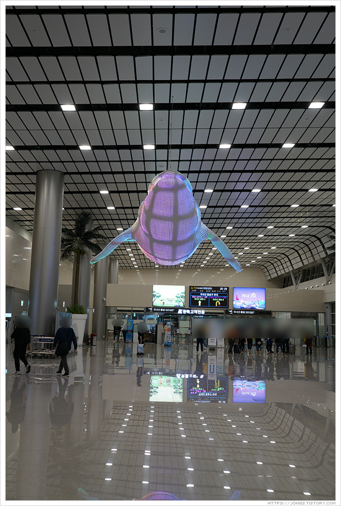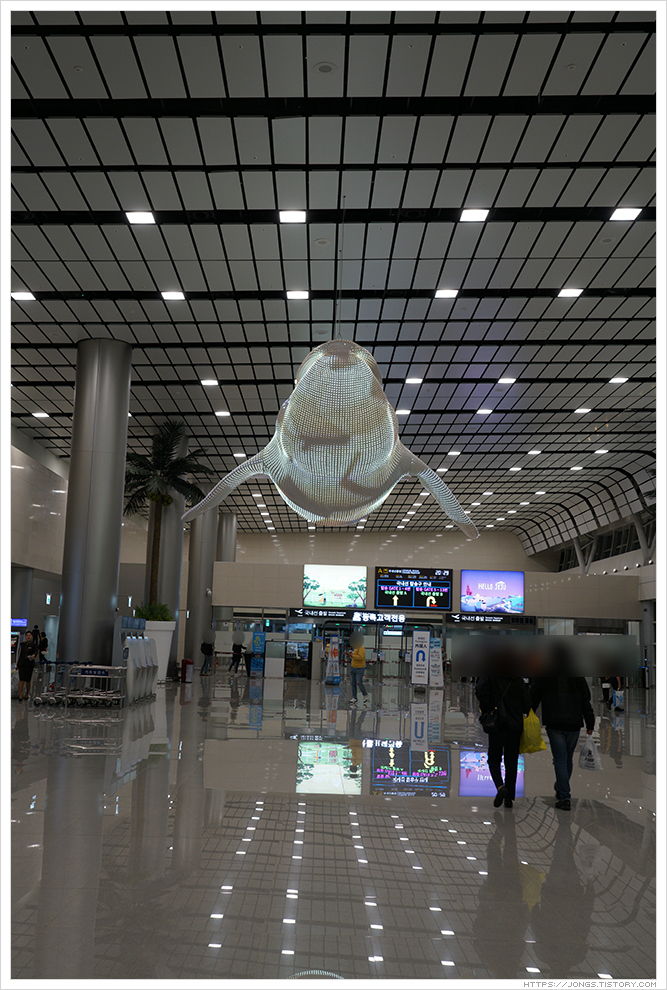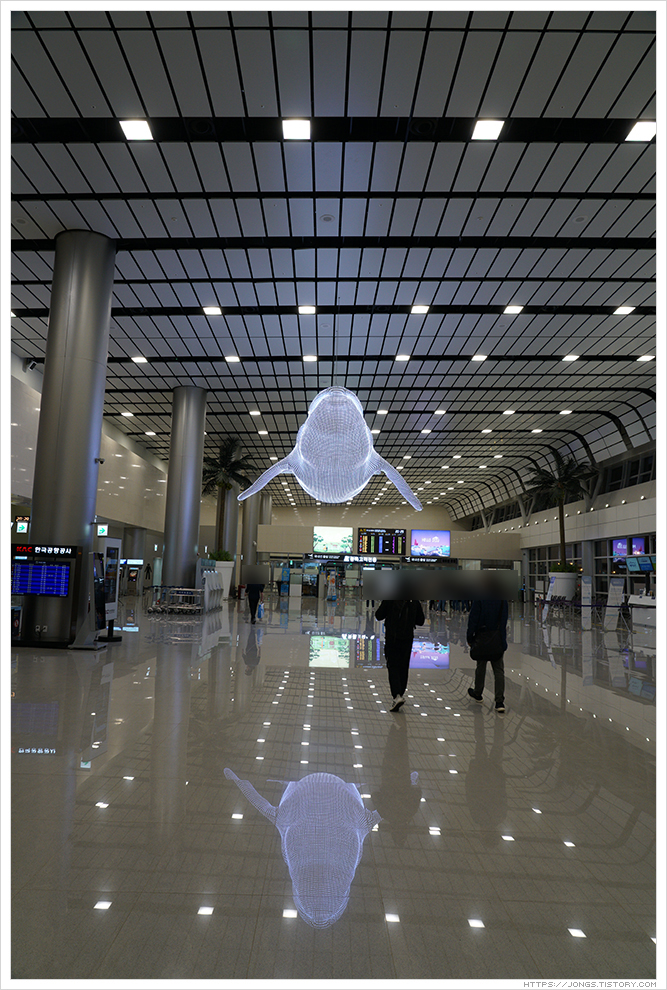 ▼ 항공권을 발권하고 국내선 출발하는 곳으로 가는 중에 고래 모형을 보았습니다. 색색으로 변하면서 사람들의 이목을 끌었습니다.