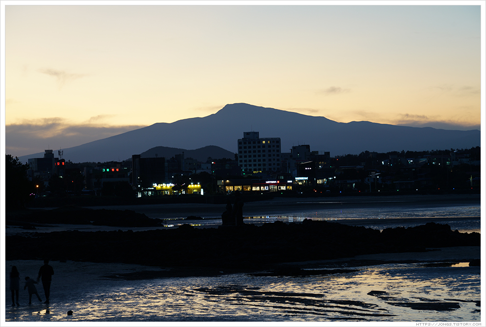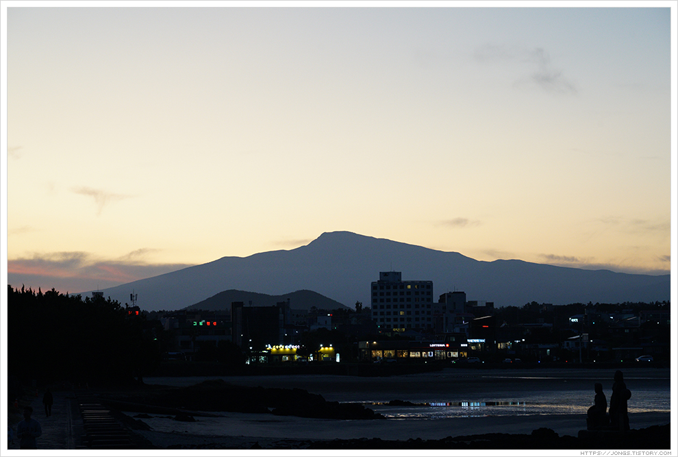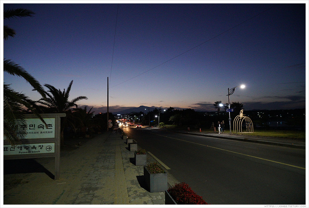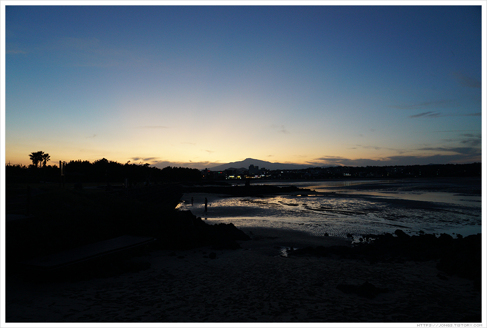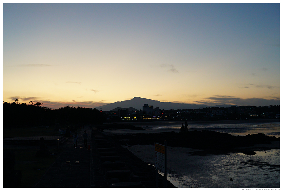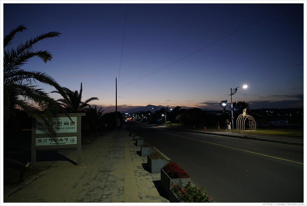 ▼ 노을이 한라산 넘어로 살짝 보이고 어둠이 서서히 내려오고 있습니다. 하늘을 아직 태양의 밝은 빛이 살짝 남아 있는데 표선해수욕장과 어우러져 너무나도 아름다운 풍경을 보여 줍니다. 잠깐 들렀다 가려고 했는데 완전히 어두워질 때까지 시간을 보내게 되었습니다.