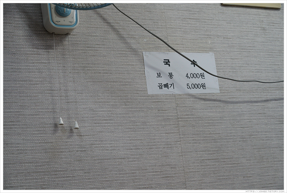 ▼ 아직 저녁 식사시간이 아니라서 아무도 없습니다. 할머니께서 테레비 방송을 보고 계셔서 식사 가능한지 여쭈니 가능하다고 하시네요. 메뉴는 멸치국수 하나라서 국수양만 결정하시면 됩니다. 가격은 보통 4,000원, 곱배기 5,000원입니다. 보통으로 주문했습니다.