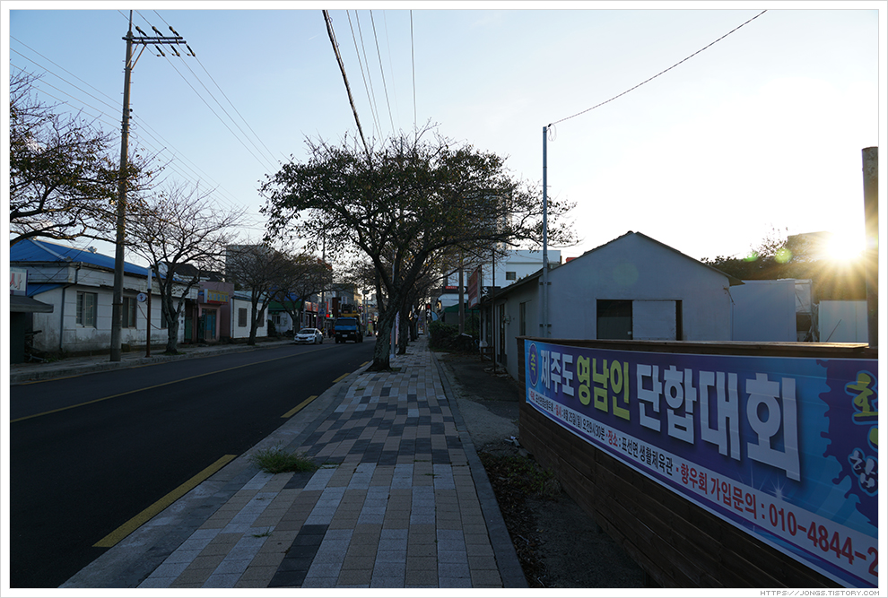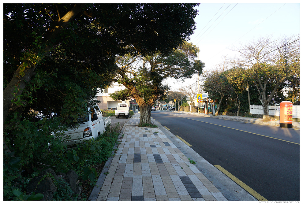 ▼ 차에서 망고주스를 먹으며 멸치국수로 유명한 '춘자멸치국수'가 있는 표선해수욕장으로 갑니다. '춘자멸치국수'는 2차선 도로와 접하고 있는데 CCTV로 주정차 단속을 하는 곳이라 주차를 하고 가는 것이 좋습니다. 특정 시간대는 주차를 허용하기도 합니다. 예전에는 골목에 주차를 했었는데 이번에는 공터 같은 곳에 주차를 했습니다. 주차장을 나오니 도로 가로수가 제주에서 볼 수 있는 나무로 제주임을 느끼게 해 줍니다.