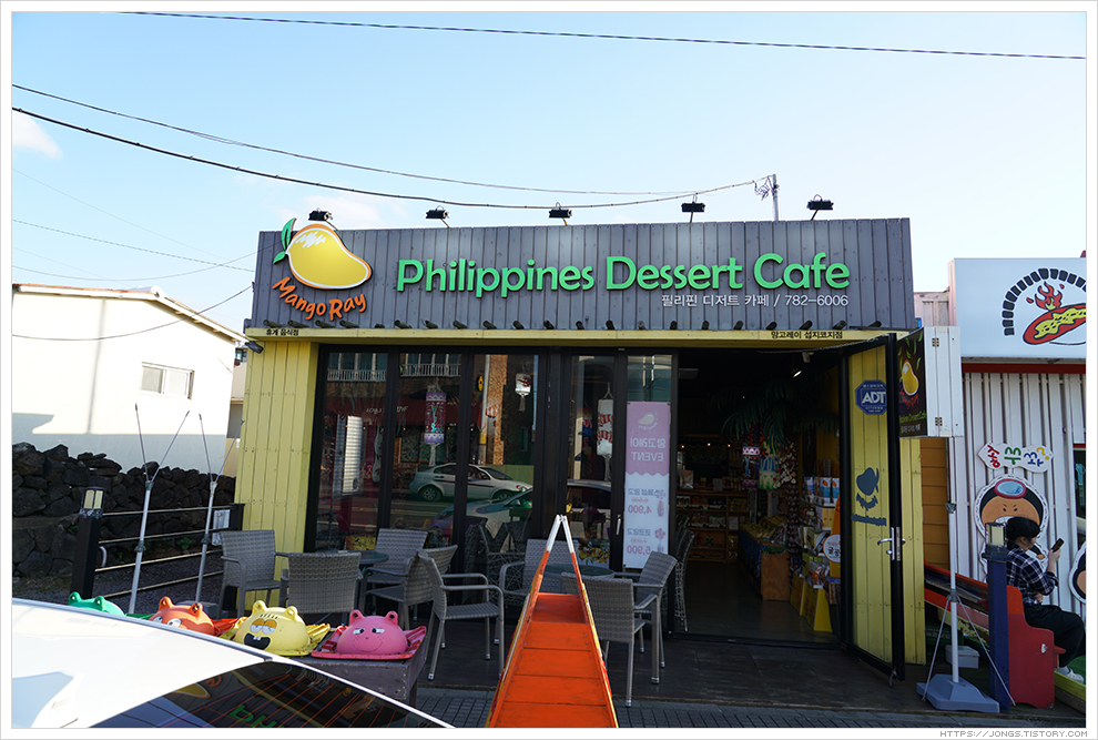 ▼ 필리핀 디저트 카페라는 문구가 함께 있는 '망고레이'는 망고 100% 음료뿐 아니라 생망고와 망고 관련 여러가지 제품도 함께 구매할 수 있는 곳입니다. '망고레이' 섭지코지점입니다.