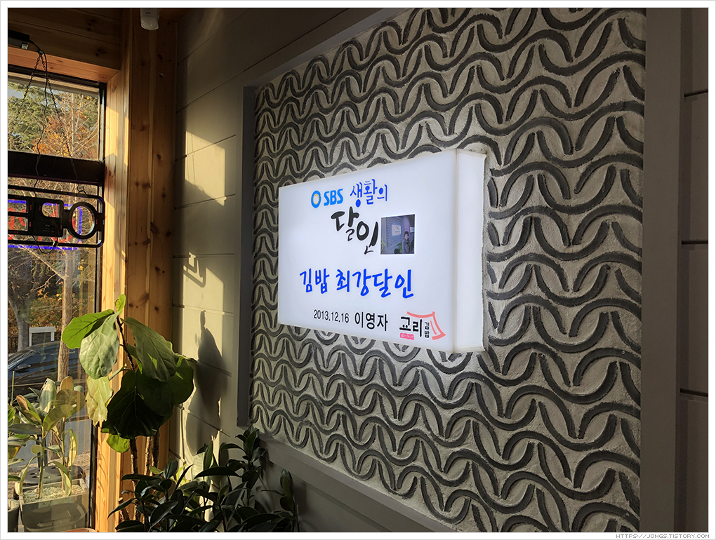 ▼ 위치는 경주 코모도호텔 옆을 돌아 보문호 오리배 타는 곳으로 내려가는 길에 있습니다. 교리김밥 주차장은 건물 안쪽에 있어 유심히 보며 입구를 찾아 들어가야 합니다. 우리는 도로편 입구로 갔는데 창문에 다양한 방송에 소개가 되었다고 홍보용도로 붙어 있습니다.