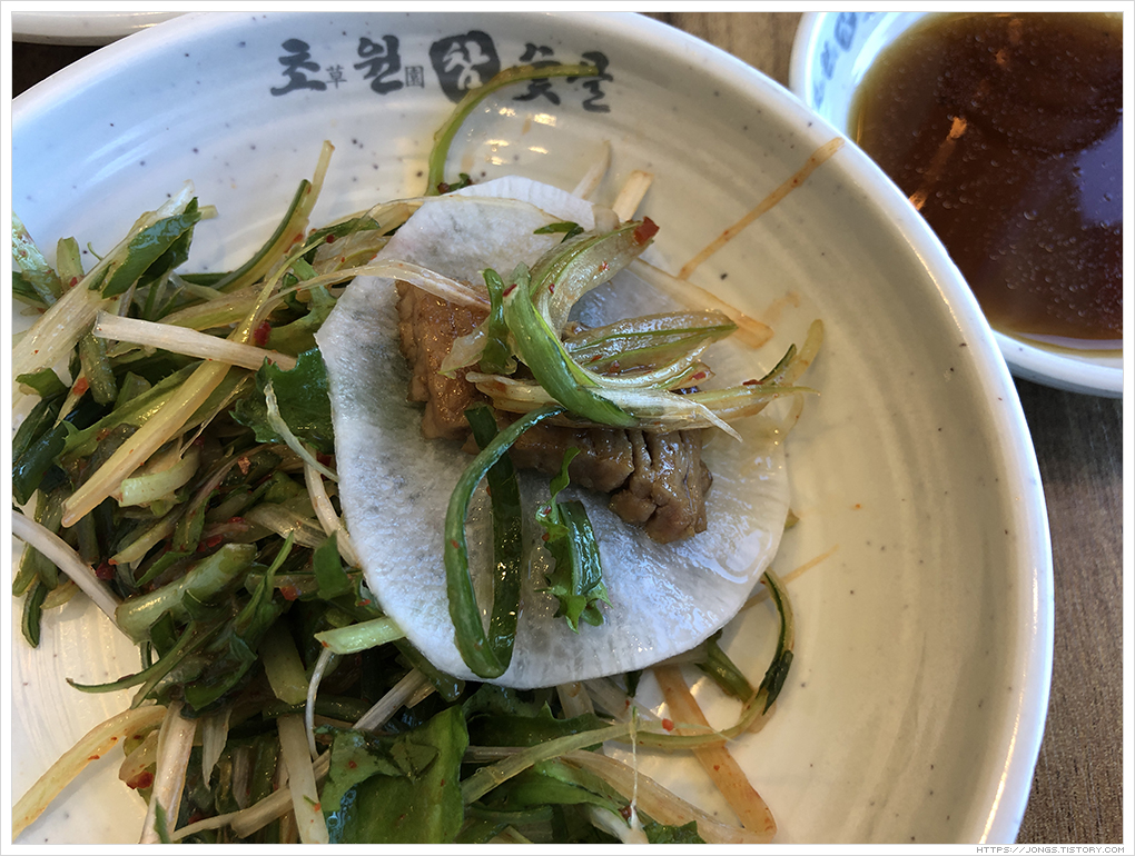 ▼ 양념이 되어 있긴 하지만 소스에 찍어서 먹으면 딱 좋습니다. 짜지 않고 달지 않고 적절히 은은하면서 고기의 맛이 올라오는 그 맛이 시간이 지나면 또 생각이 나게 만들죠.