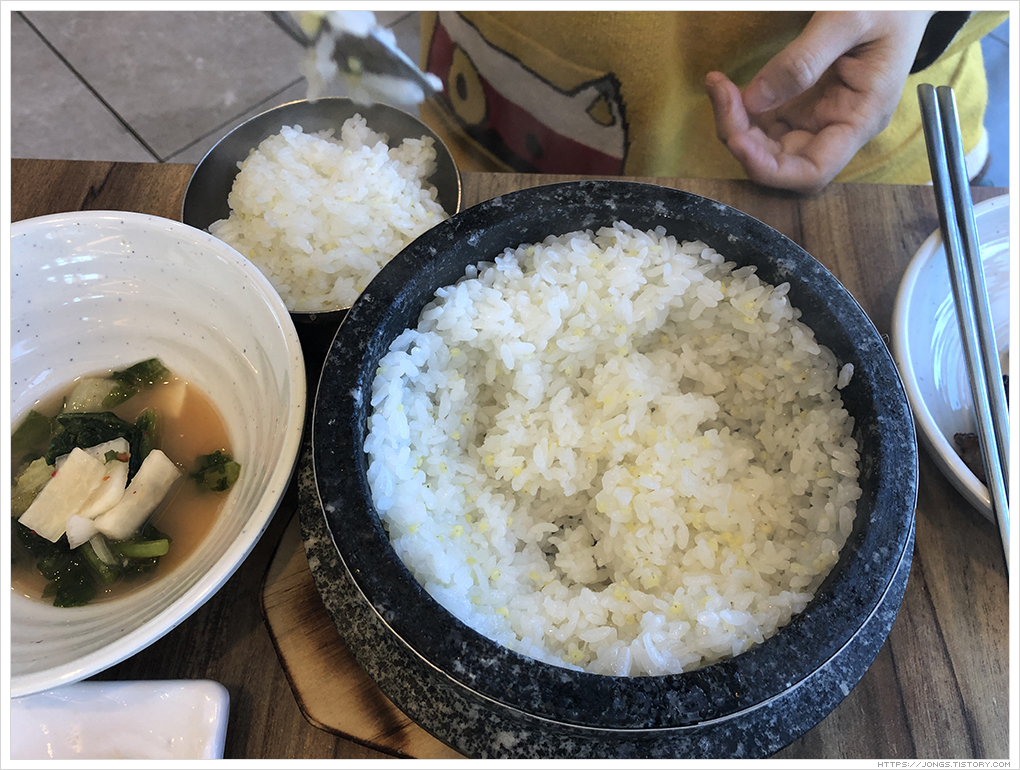 ▼ 돌솥 2인분이 함께 나왔습니다. 돌솥에 바로한 밥을 퍼서 먹으면 밥만 먹어도 맛있다는 생각이 듭니다. 좁쌀이 함께 들어가 있는데 갓 지은 밥 + 양념돼지갈비 한점 + 된장찌개면 다른 반찬이 생각나지 않을 정도로 맛 있고 고기만 먹을 때 보다 서로 시너지가 되어 맛이 고소함과 감칠맛이 폭발합니다. 마님은 물을 부어 누룽지로 먹는 것을 좋아합니다.