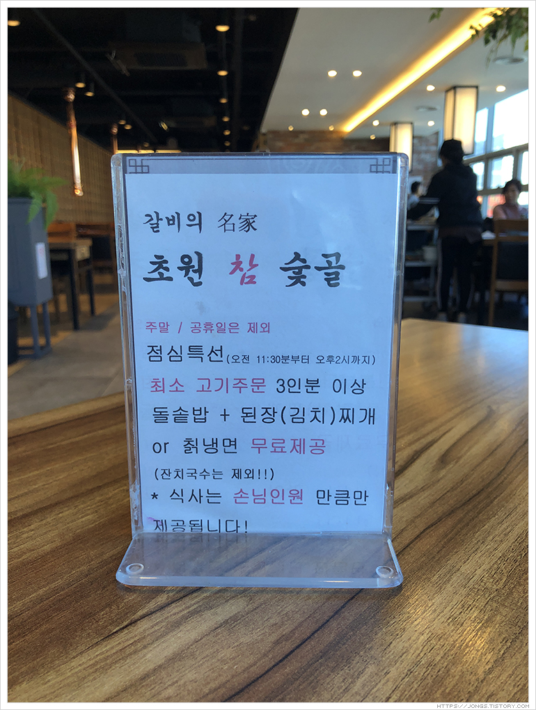 ▼ 평일 점심특선 메뉴(주말/공휴일 제외)입니다. 평일 11:30~14:00까지 운영하며 고기주문을 3인분 이상하면 돌솥밥+된장(김치) 째개 또는 칡냉면을 무료제공한다고 합니다. 식사는 손님인원만큼만 제공된다고 합니다. 고기는 제 기준에서 마님과 함께 오면 4인분 정도 먹기 때문에 3인분 먼저 주문하고 밥 나오기 전에 1인분 추가주문을 합니다.