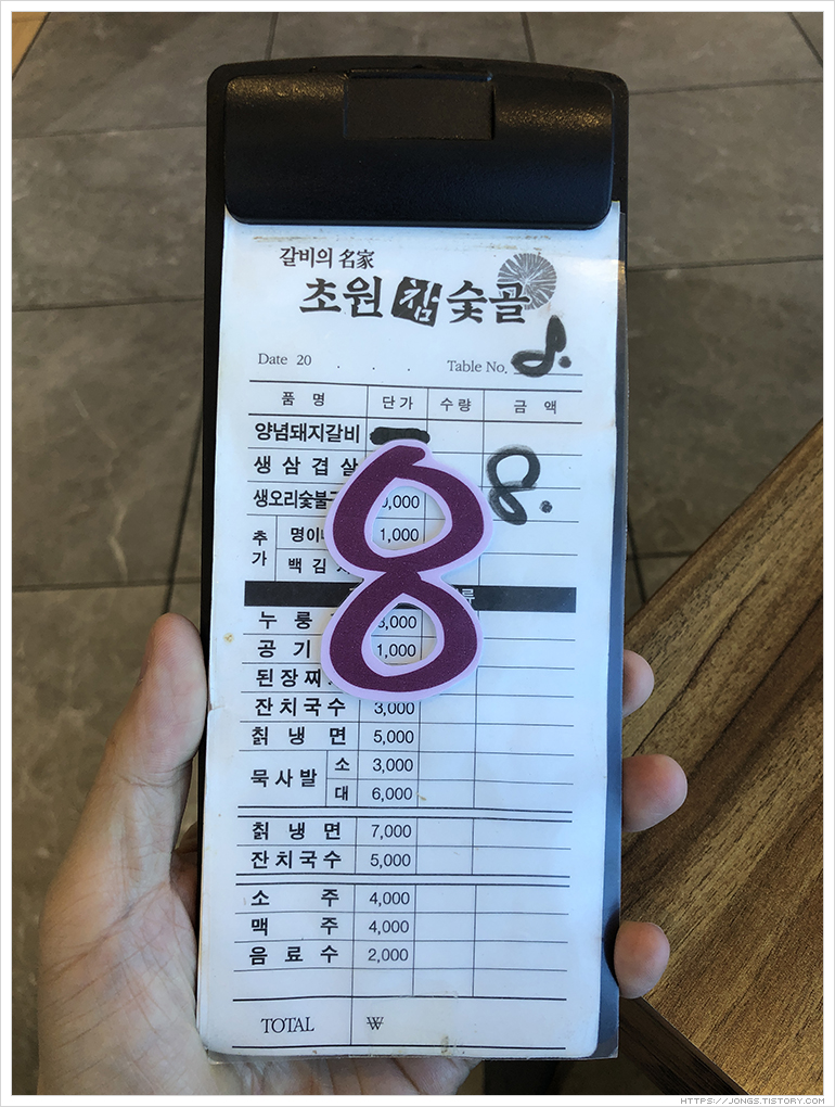 ▼ 메뉴판이 없어 주문내역서를 촬영했습니다. 명이나물과 백김치는 추가로 주문하면 추가요금이 있습니다.