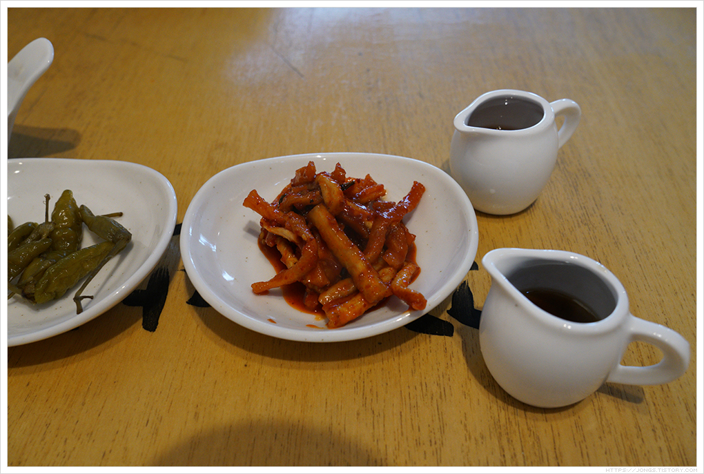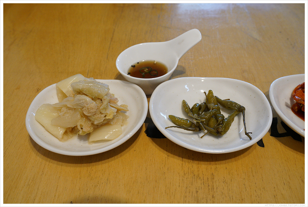 ▼ 다행이 사람이 많지 않아 마님이 바로 자리를 잡을 수 있었습니다. 1층과 2층에 테이블이 있는데 보통은 2층을 선호합니다. 창 밖으로 제주도 풍경을 보면서 식사를 할 수 있기 때문인데 2층에서도 창문 아래 바 형태로 된 테이블에 4명 정도 앉을 수 있는 곳만 제주도 풍경을 보며 제주에 왔구나를 시각적으로 느끼며 식사를 할 수 있습니다. 인기가 많아 다른 테이블에 있다가도 그 자리가 나면 눈치게임으로 순식간에 자리를 옮기는 곳입니다. 음식은 2인세트로 주문을 했습니다. 2인 세트는 원래 딱새우장비빔밥 2개 + 도마반판(수육반판)인데 마님이 딱새우장비빔밥 1개를 돌문어장비빔밥으로 교체를 했습니다. 기본 반찬은 백김치, 산고추장아찌, 오징어무말랭이 무침, 비법간장 소스로 준비가 됩니다.