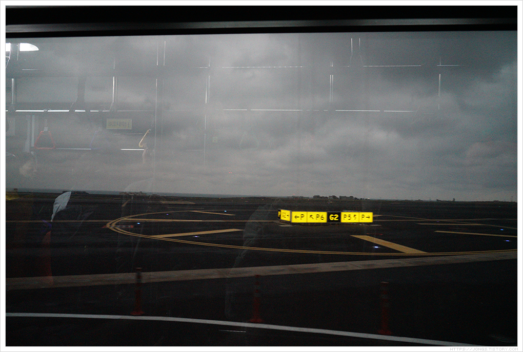 ▼ 제주공항에서는 버스를 타고 공항으로 갑니다. 버스에 타고 있으니 밖이 더 어두워 보이네요. 비가 많이 올려나 싶습니다.