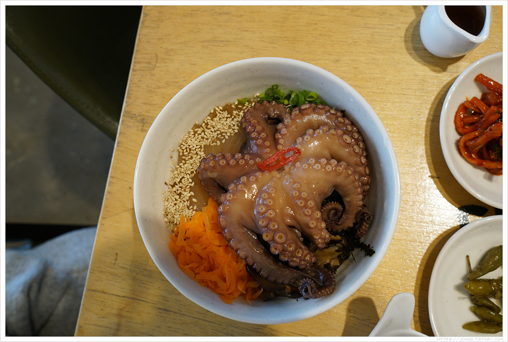 ▼ 돌문어장비빔밥입니다. 돌문어 한마리가 삶아져 나오고 조림무, 파, 당근, 김, 밥 등이 그릇에 담겨져 나옵니다. 삶은 문어에 살짝 간이 되어 있어 좋았고 문어를 잘 못 삶으면 질기다고 하던데 정말 부드러웠습니다.