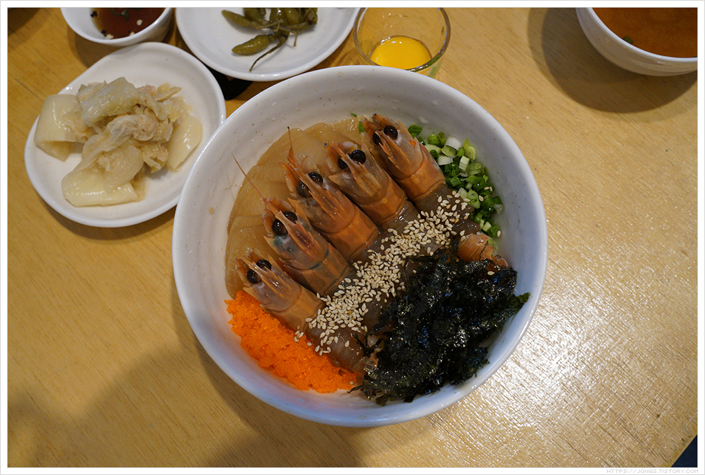 ▼ 얼마 지나지 않아 주문한 메뉴가 나옵니다. '딱새우장비빔밥'입니다. 요즘 인스타그램 등 SNS에 사진을 찍어서 많이 올리는데 그래서인지 사진을 담았을 때 상당히 예쁘게 나옵니다. 색이며 재료 플레이팅이을 상당히 신경써서 한 것 같습니다.