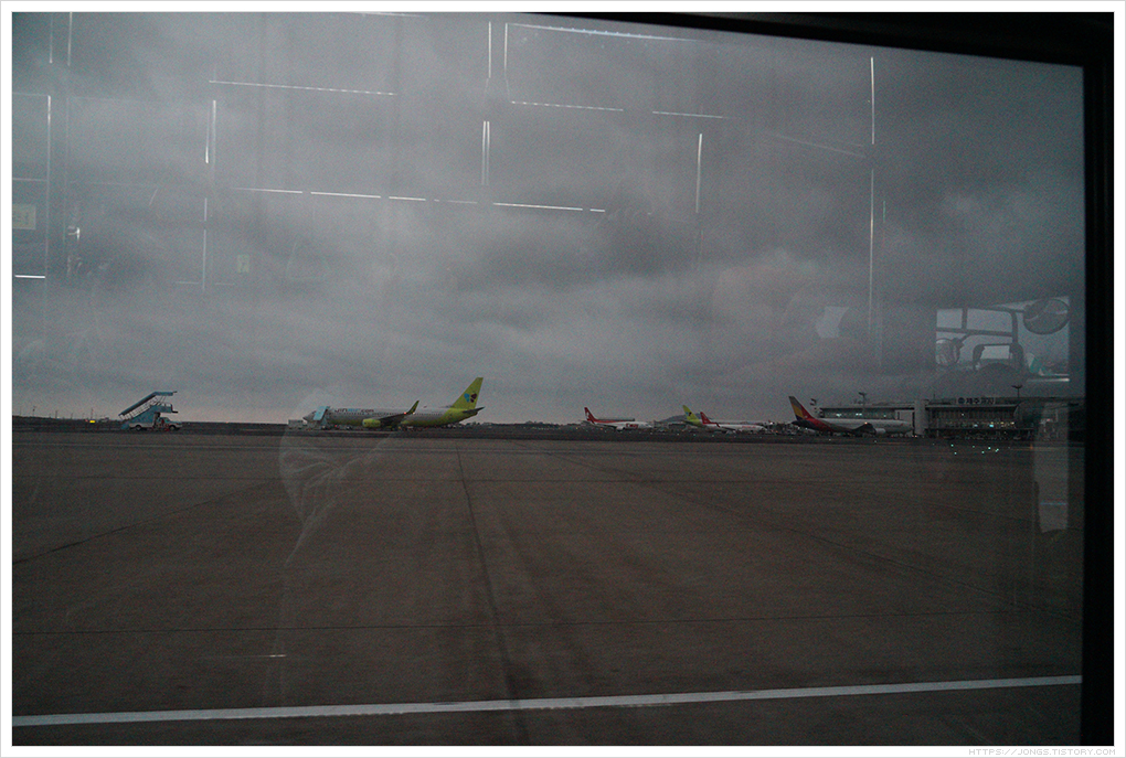 ▼ 비 구름을 뚫고 제주공항에 잘 착륙했습니다. 구름 속으로 들어가니 비가 상당히 많이 내렸고 제주공항에 착륙 후에도 빗방울이 창문으로 떨어지더군요. 그리고 바람도 많이 부는지 비행기가 롤러코스트 처럼 떨어지는 느낌도 들었습니다. 비행기 밖으로 나와 보니 바람도 많이 불었고 보이는 구름도 비올 것 같은 구름입니다. 아침에 출발 후 떠 올랐던 해가 구름에 가려서 아예 보이지 않습니다.