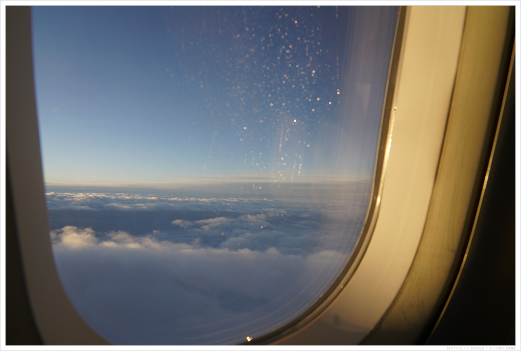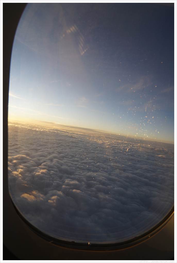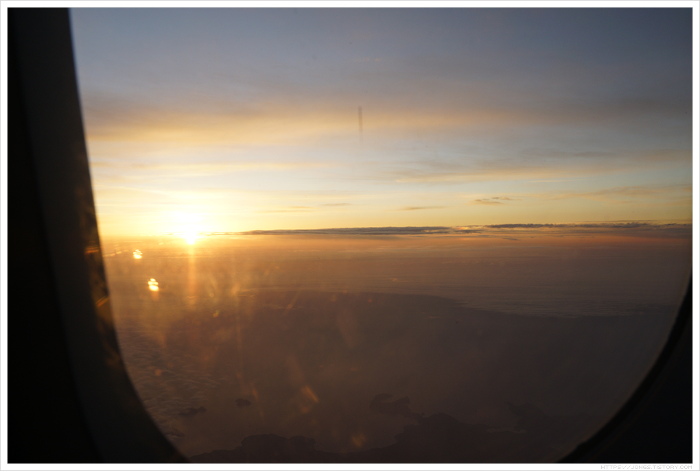 ▼ 구름 위로 떠 오르는 태양입니다. 10월에는 이륙전에 비행기에 있을 때 해가 떴고 11월 말인 지금은 이륙 후 해가 떠 오릅니다. 동지가 지나면 해 뜨는 시간이 빨라지겠죠. 아침에 출발하는 비행기에서 해 뜨는 것을 두번째 보고 있습니다. 너무 아름답네요. 비행기에서 해 뜨는 것을 보고 싶으신분들은 참고하시면 될 것 같습니다. 아침 첫 비행기라 대부분의 손님들은 잠을 청합니다.