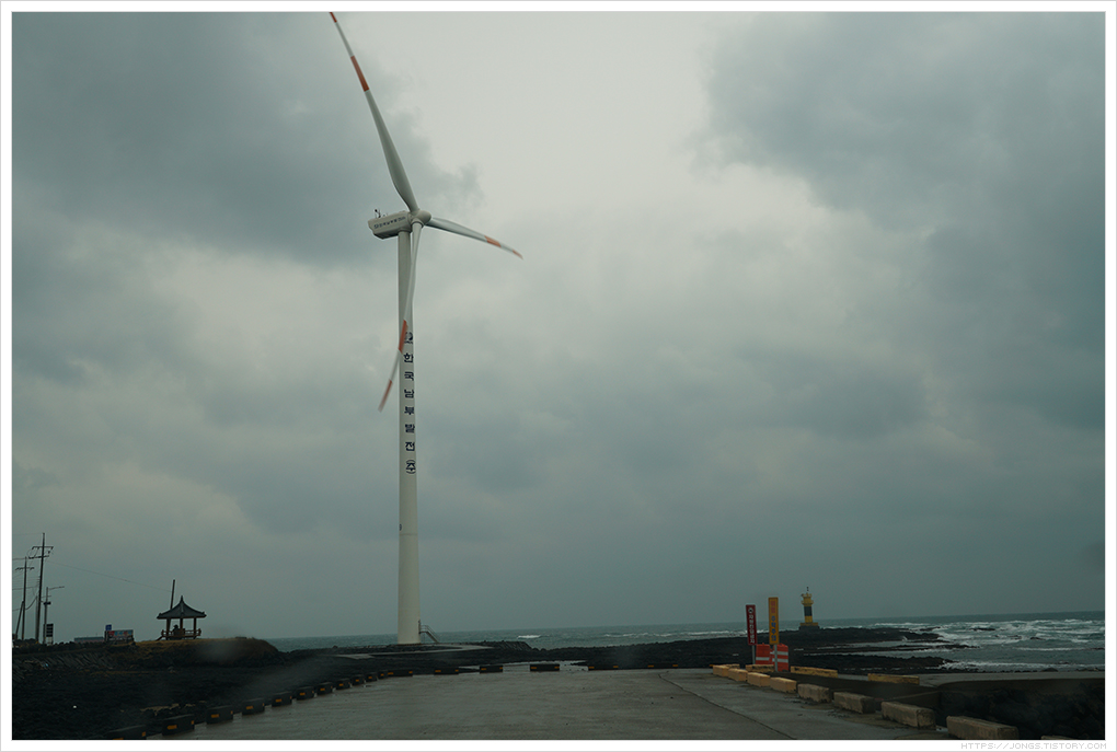 ▼ 방주교회를 갔다 신창고산해안도로(한경해안도로)를 따라 드라이브를 했습니다. 고산초등학교와 용수항을 기준으로 네비게이션을 이용해 길을 찾아 들어 갔습니다. 해안도로 드라이브를 하는 중에 풍력발전기가 많이 있는 곳에 잠깐 차를 세우고 구경하다 비행기 시간이 다 되어 가는 듯 하여 렌트카 빌린 곳으로 해서 제주국제공항으로 갔습니다. 풍력발전기에 바람이 스치는 소리와 파도가 세차게 치는 소리와 모습, 구름이 이동하는 모습은 정말 장관이었습니다.