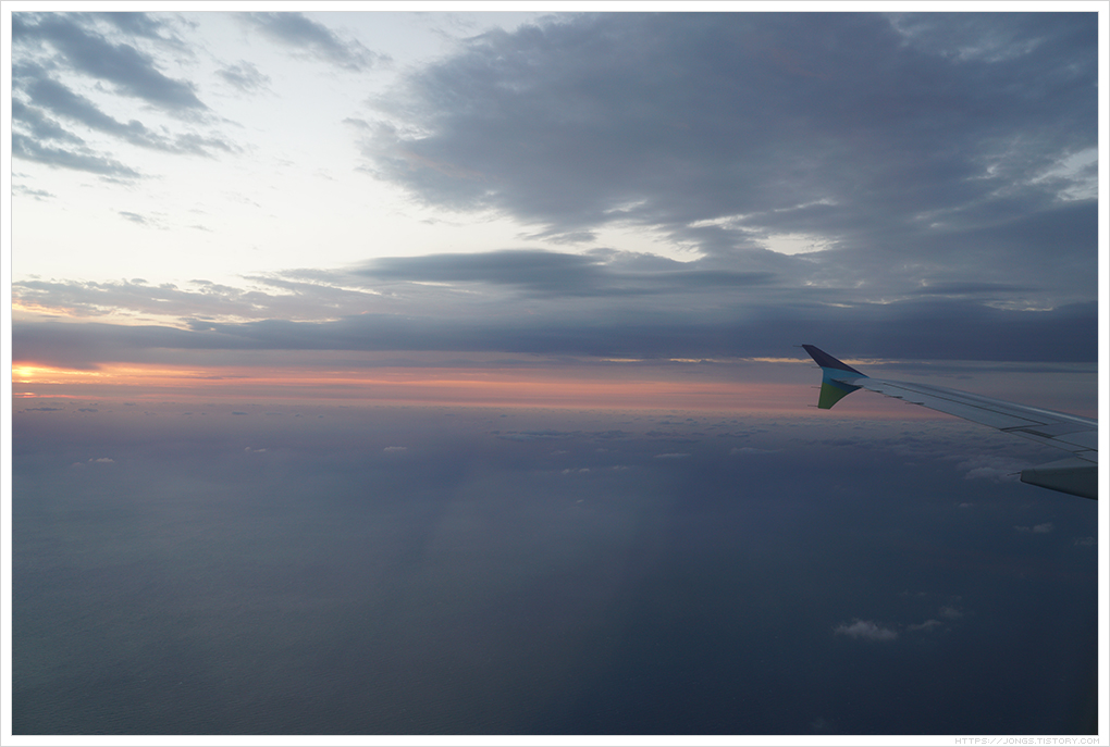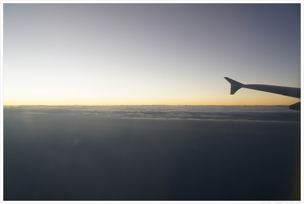 ▼ 20~30분 후 하늘이 붉게 물들기 시작하며 아침해가 떠 올랐습니다. 비행기 위로도 구름이 있고 아래로도 구름이 있어 구름 사이에 해가 떠오르는 진풍경이었습니다. 해가 떠오르고 시간이 지나면 다시 구름에 해가 가리는 자연의 신비를 볼 수 있었다니 기분이 좋았습니다. 해 뜨는 것을 보고 잠이 와서 눈을 살짝 붙였습니다.