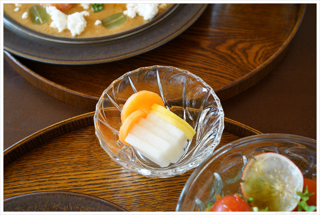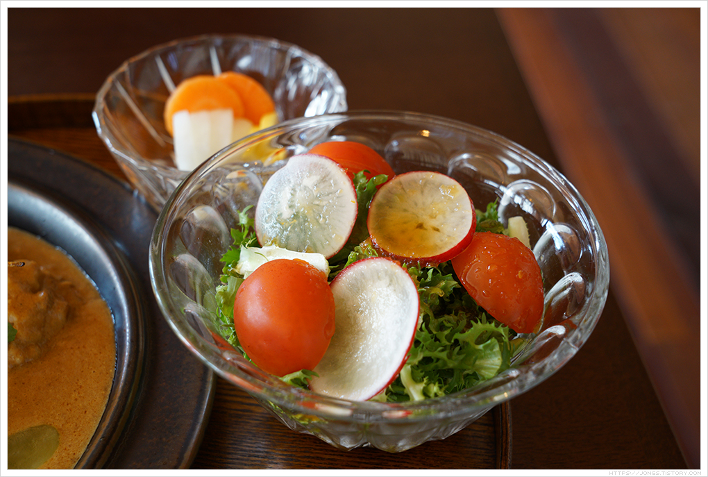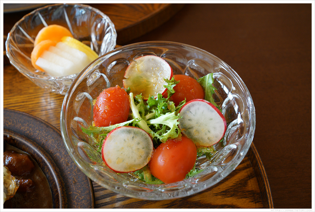 ▼ 직접 손으로 쓴 메뉴판입니다. 예약할 때 음식도 미리 주문해 놓습니다. 그렇기 때문에 시간이 많이 걸리는 경우 취소를 하고 다른 곳으로 갈 수가 없으니 주문을 할지 말지 결정을 하세야 합니다. 종류가 많지는 않고 히비정식(닭튀김과 채소튀김에 전용 소스가 함께 뿌려진 샐러드 같은 것), 함박정식(함박스테이크), 에비카레(새우크림카레) 3가지 메뉴고 나머지는 음료 5종류가 있습니다. 메뉴판에도 있지만 1인 1메뉴 주문이고 테이블 수가 적어서 식사 후 추가 음료 주문은 받지 않는다고 합니다. 2인용 작은 테이블 3개에 긴 테이블 하나만 있습니다. 뒤에 오신 분들은 6인 정도 앉을 수 있는 긴 테이블에 2팀이 나누어 앉았습니다. 주문은 함박정식(16,000원)과 에비카레(16,000원)로 했습니다. 함박정식과 에비카레는 다른 곳에서 접하기 쉬운 메뉴라서 히비정식을 많이 주문한다고 SNS에는 많이 올리셨더라구요. 그리고 준비된 재료가 소진되면 문을 닫는다고 합니다.