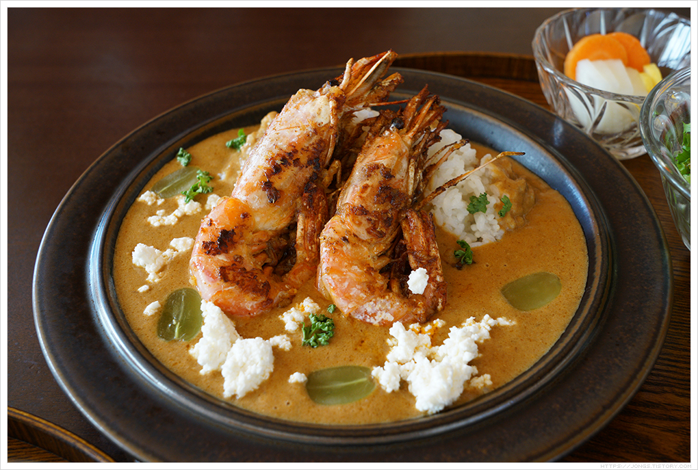 ▼ 에비카레입니다. えび(에비)가 새우입니다. 새우 2마리가 들어가 있고 페타치즈와 청포도 반 자른 것이 들어가 있습니다. 상큼함과 달콤한 청포도가 크림카레와 잘 어울리는 듯 합니다. 카레에 크림이 들어가 있었고 개인적으로는 맛 있었습니다. 새우 때문에 가격이 높은 것인 듯 하나 마님은 가성비는 아쉽다고 합니다.