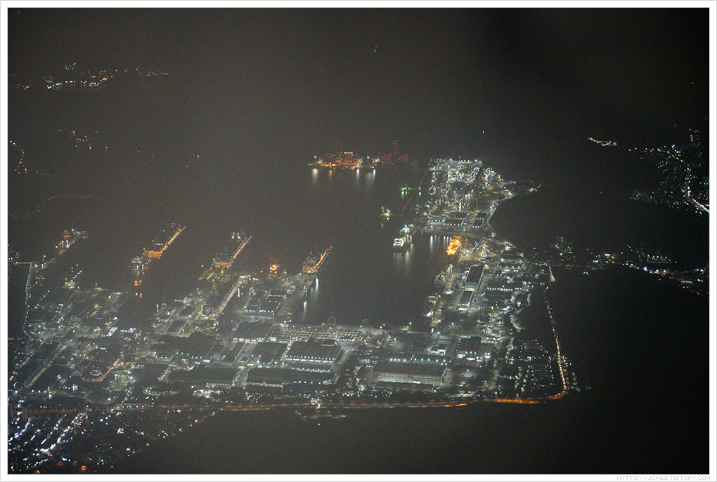 ▼ 거가대교도 보이고 조선소 같은 곳도 보입니다. 밤에 하늘에서 내려다보는 지상 야경이 참 아름답네요.