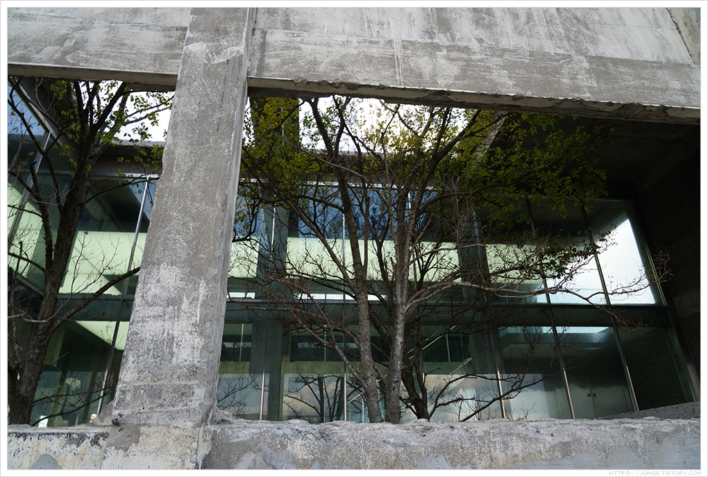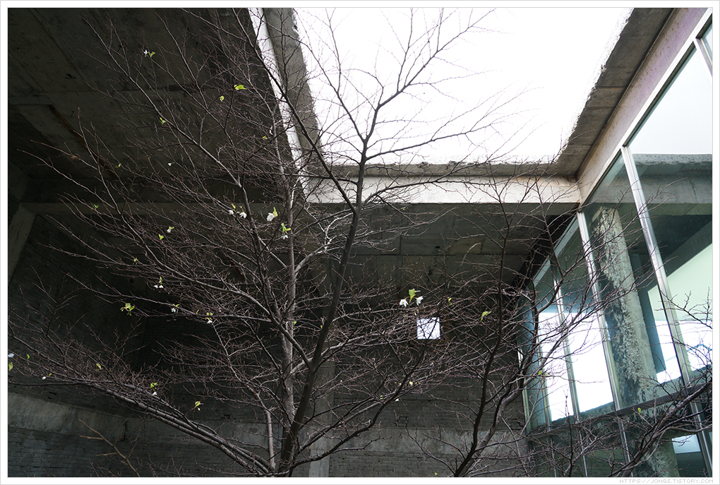 ▼ 그리고 공장의 빈 공간에 나무를 심어 놓았습니다. 이곳의 포인트입니다. 바닥이 그대로 노출이 되어 있고 위쪽에 하늘이 그대로 노출이 되어 있어 비가 오면 비가 내리고 햇빛이 들면 그대로 빛이 들어오는 구조로 되어 있는데 사람이 보는 곳에는 창문이 있어 자연의 나무도 전시된 조형물 처럼 거리를 두고 보게 되는 느낌입니다. 처음에는 인조나무로 생각했었는데 자세히 보니 살아 있는 나무로 보였습니다. 나무가 자연의 일부로 있거나 인공적인 곳에 자연스럽게 보이도록 했었는데 전시물이 되게 할 수 있고 예술의 경계와 생각의 전환이라는 것을 상기시키게 되더군요. 여러 생각이 드는 곳이였습니다.