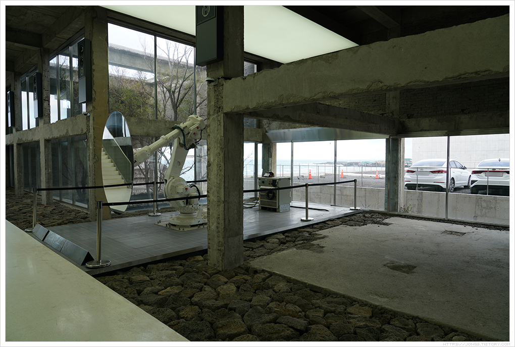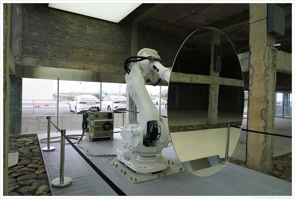 ▼ 주차장 왼쪽에 공장건물이었던 것으로 추측 되는 곳에 음악이 흘러나오고 로봇팔이 거울을 들고 있는 예술공간?! 전시공간?!이 나옵니다. 음악이 흘러나오는 것이 포인트이고 거울이 양쪽으로 하나씩 있는데 이 곳의 포인트 중 하나입니다. 로봇팔이 움직이는지는 모르겠지만 커다란 거울을 들고 있고 거울을 깨끗이 닦여 있습니다. 일종의 예술 조형물 같습니다.