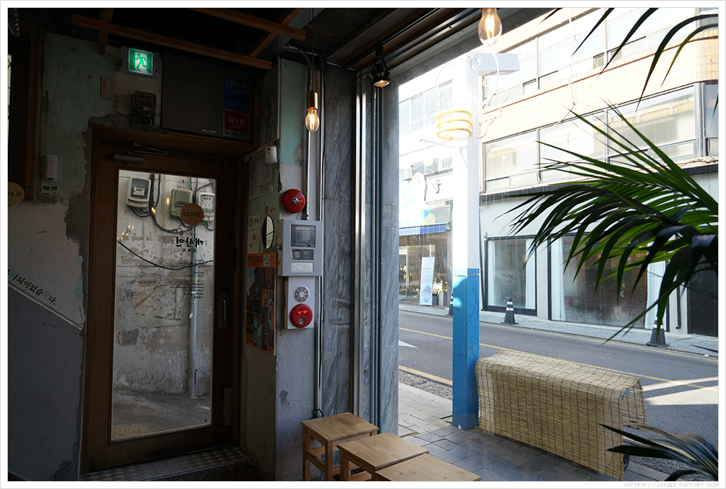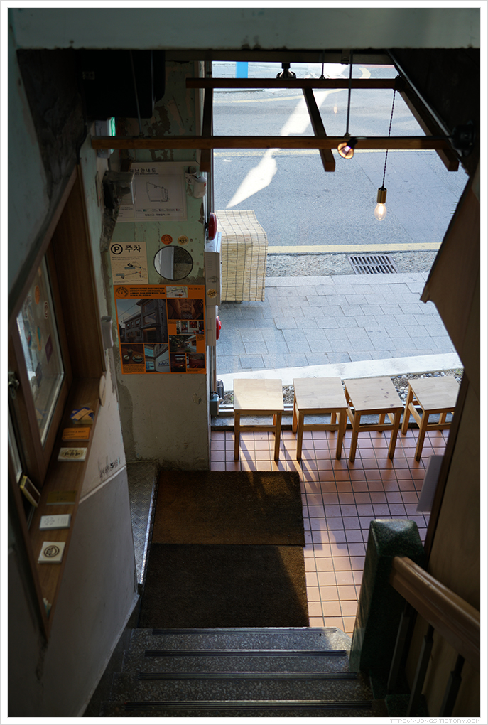 ▼ 제가 앉은 곳이 입구쪽 가장자리쪽이라 입구와 2층 올라가는 계단을 촬영해 보았는데 옛날 건물의 느낌이 물씬 묻어나옵니다. 나무로 된 작은 문은 주방으로 들어가는 문입니다. 앉은 방향으로는 주방이 보이고 등 뒤쪽에는 도로가 있는데 큰 유리로 되어 있어 밖을 잘 볼 수 있습니다.