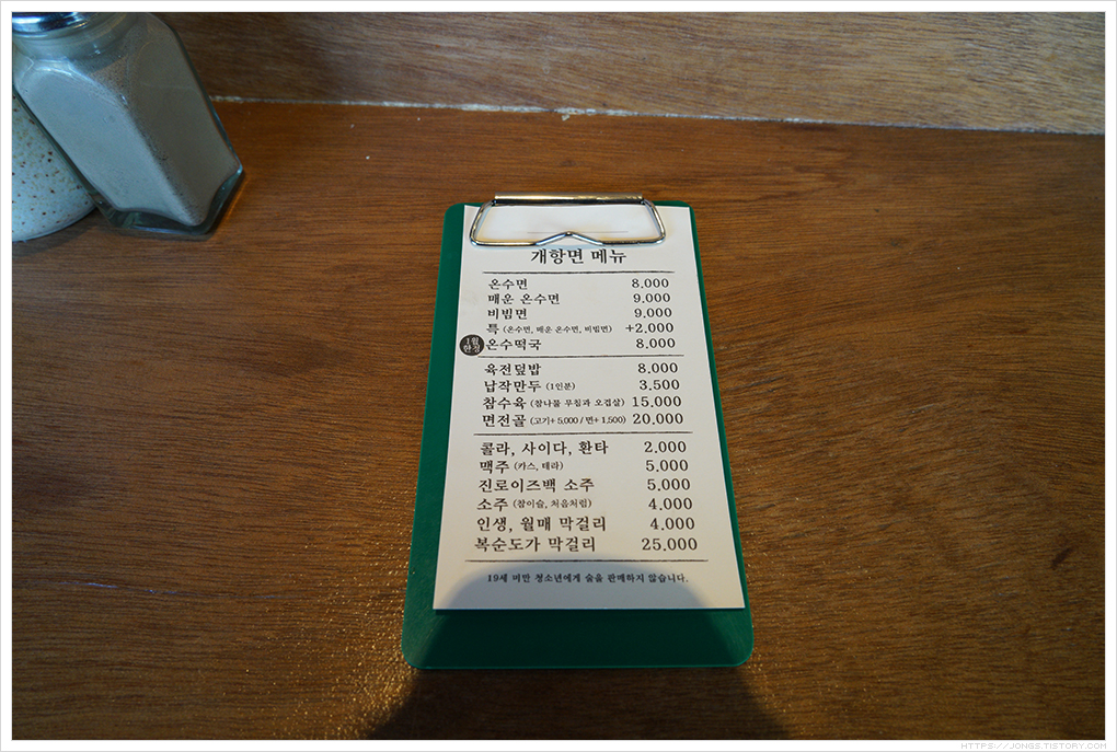 ▼ 1층과 2층이 있는데 1층은 바 형태로 되어 있고 2층은 테이블 형태로 되어 있습니다. 혼자 와서 1층에 자리 잡았습니다. 옆에 앉은 분들은 2분씩 오셨는데 바에 앉으셨더라구요. 메뉴는 아래 사진과 같습니다. 온수면과 함께 육전을 먹고 싶었는데 자세히 보니 육전덮밥이였습니다. 일단 날씨가 추워서 뜨끈한 국물이 있는 온수면을 주문 했습니다. 매운 온수면은 칼칼해 보이던데 추워서 시켜볼까 고민이 되었지만 매운 것을 잘 못 먹어서 일단 보류했습니다.