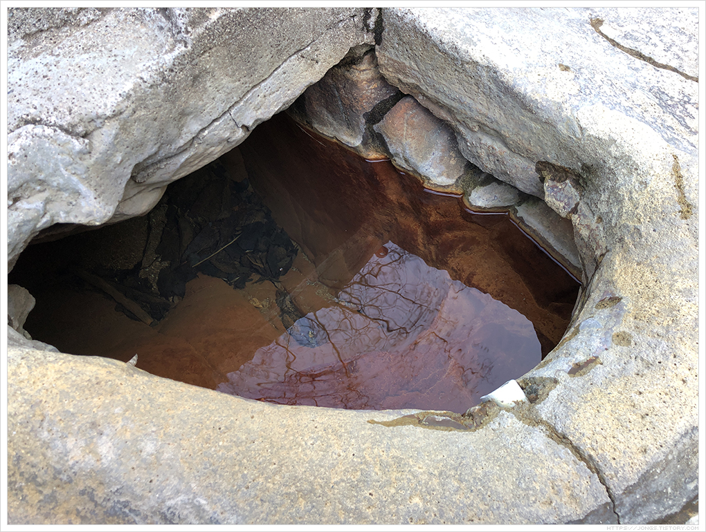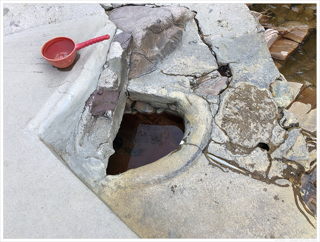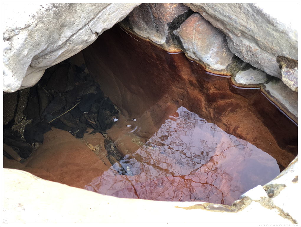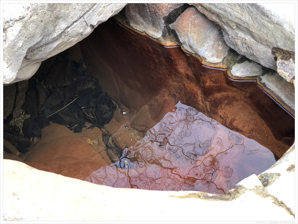 ▼ 물은 상당히 맑습니다. 주변이 붉은 색인데 철이 들어 있어 공기중 산소에 의해 산화가 되면서 붉은색을 띤다고 합니다. 또한 철로 인해 약수를 먹으면 맛이 비릿하죠. 소화를 시키는 장기 중 위에 좋다고 합니다. 탄산도 조금 들어 있습니다. 대각선으로 오른쪽 위쪽에 거품이 뽀글뽀글 올라오고 있습니다. 지켜보다 보면 바위틈 여러곳에서 거품이 올라 오는 것을 볼 수 있습니다.