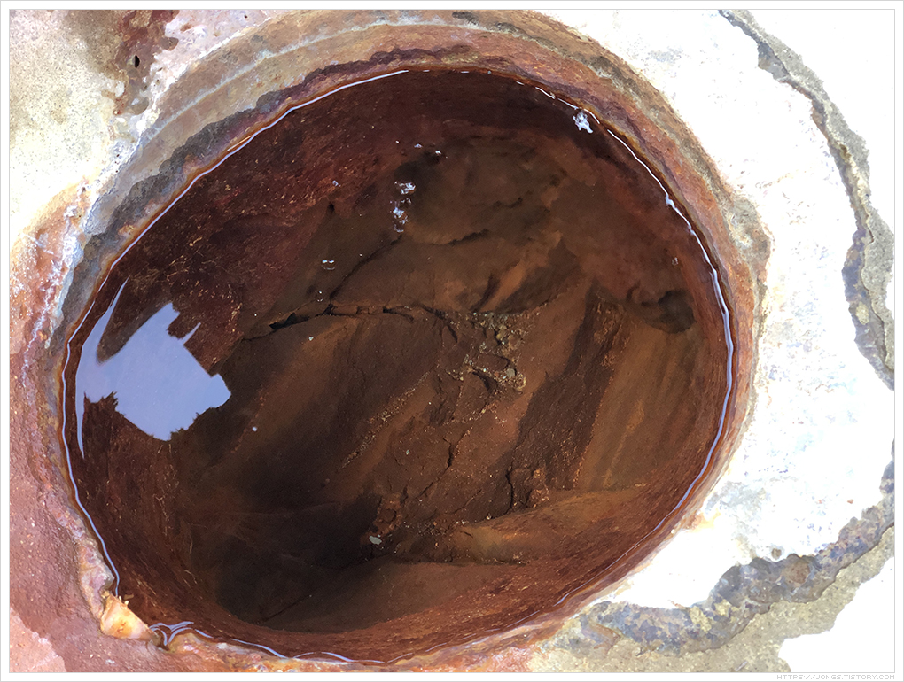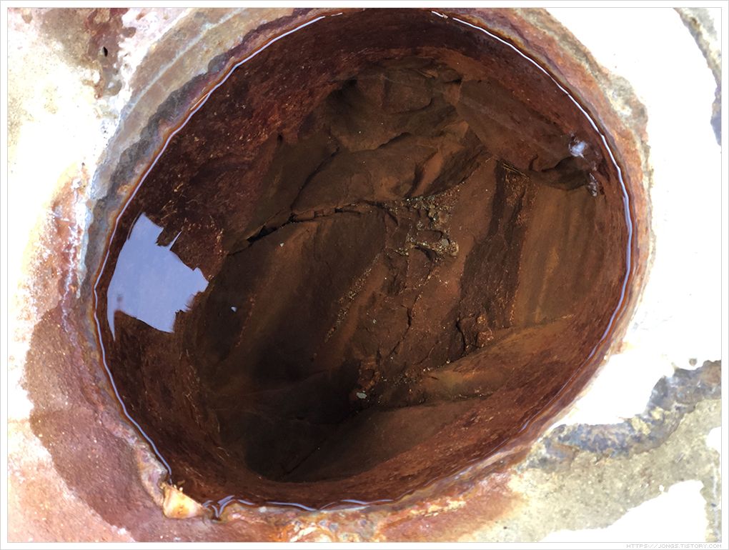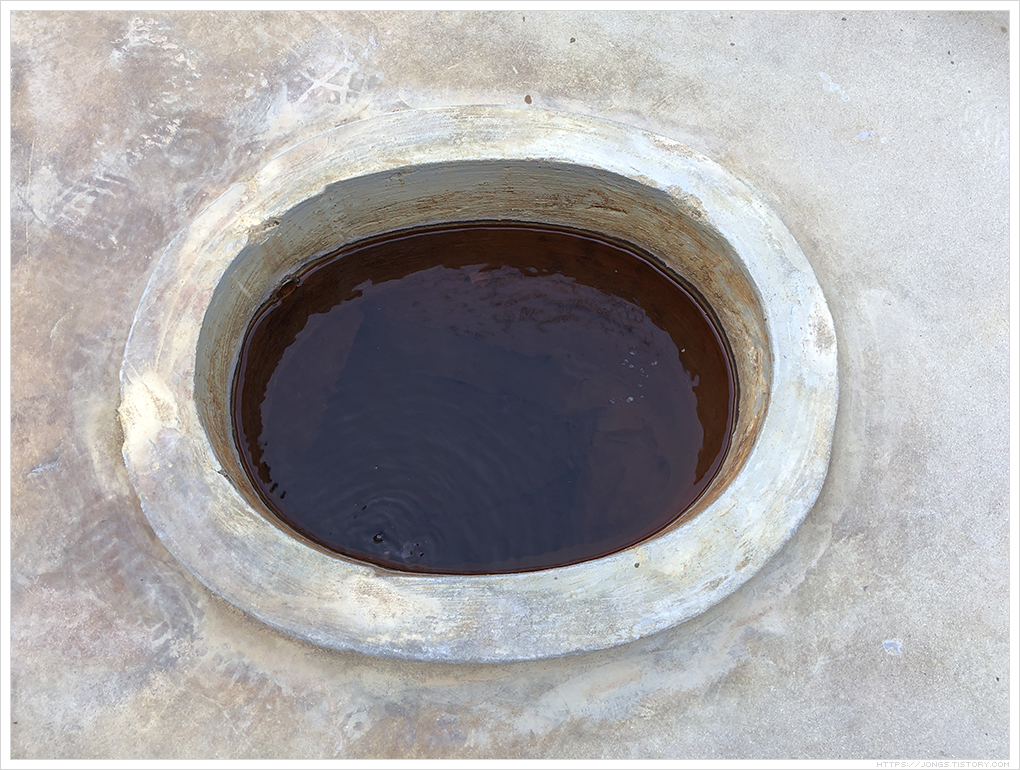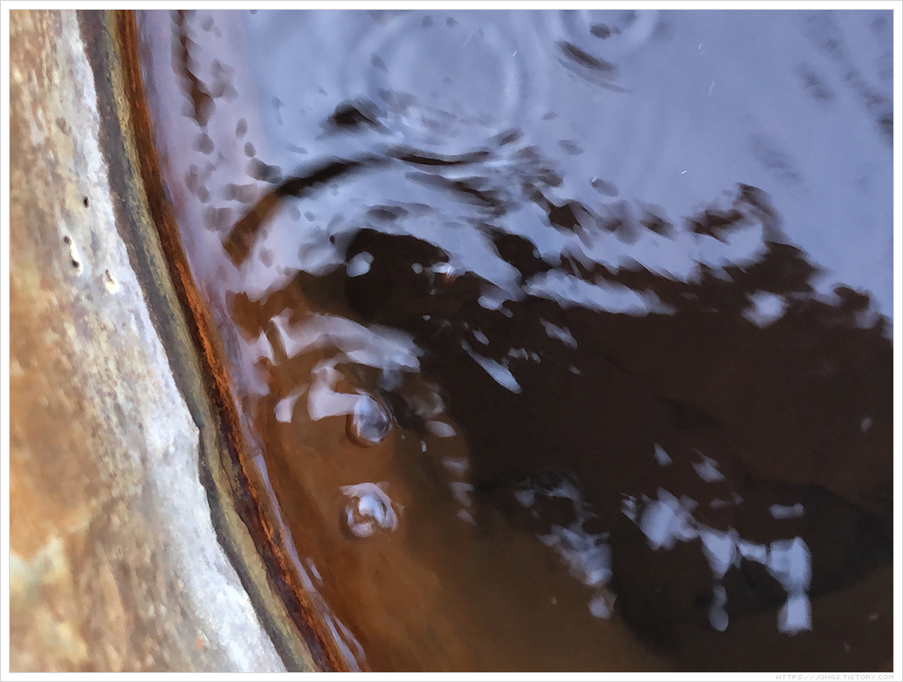 ▼ 지붕이 없는 곳이라 노지로 되어 있습니다. 그래서인지 나뭇잎이 들어가 있더군요. 역시 붉은색을 띠고 탄산도 뽀글뽀글 올라옵니다. 거품이 올라오면 위에 물결이 일렁입니다.