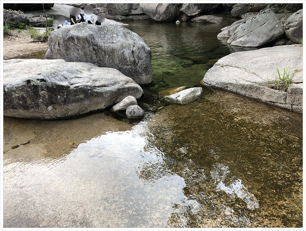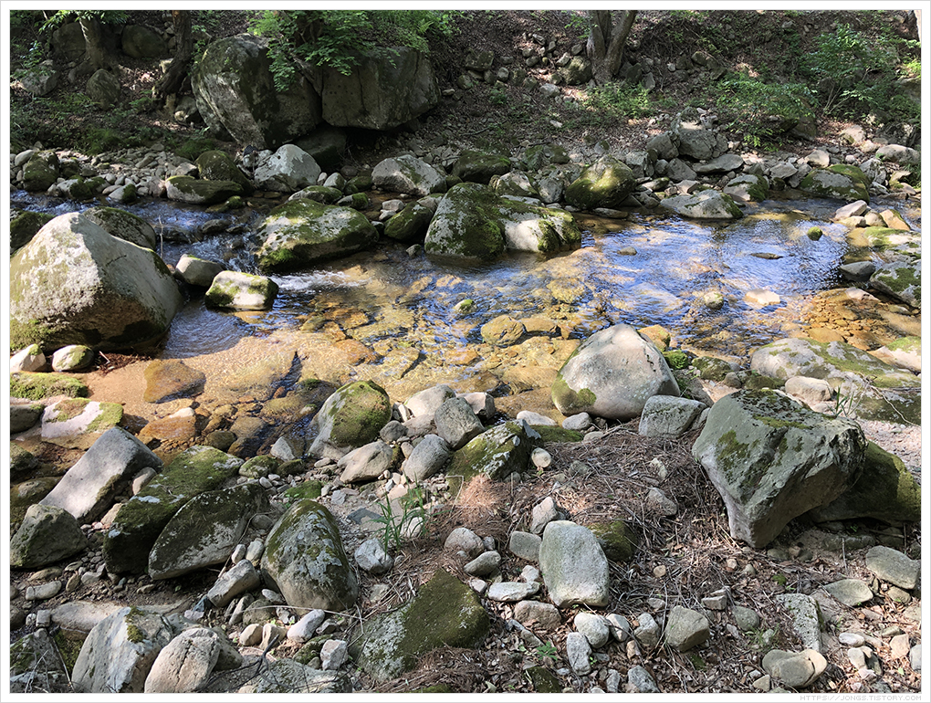 ▼ 계곡에 들어가고 싶을만큼 물이 깨끗합니다. 사람들의 손길이 최소화 되어 더 깨끗한 것 같아요. 계곡에는 임시 다리가 놓여져 있습니다. 예전에 왔을 때는 스님이 돌로 징검다리를 만들어 주셨던 것이 기억에 남았는데 건축용 비계를 이용해 다리가 임시 만들어져 있었습니다. 그리고 제게 작은 이벤트도 있었습니다. ^^;;;