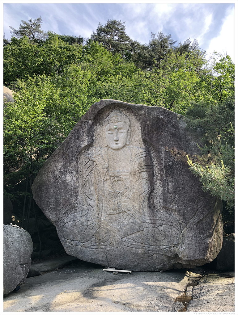 ▼ 암반위를 흐르는 '봉암용곡' 옆으로 커다란 돌덩이에 새겨진 마애보살좌상은 보고 있으면 참 오묘한 느낌이 듭니다. 모든 종교가 그렇겠지만 종교적인 이유로 만들어진 것은 사람으로 하여금 저절로 숙연하고 경배하게 만드는 묘함이 있는 것 같습니다. 예전에 석가탄신일이 되면 마애보살좌상 앞에 케이크를 놓고 가서 사람들에게 회자되고 했었던 기억이 떠 오르네요. 제가 간 시간에는 조용했습니다. 몇 몇 분들 계곡 옆에 앉아 계시고 위쪽에서 잠도 청하시고 애들은 계곡에 발 담궈서 신나 있는 모습이 참 정겨웠습니다.