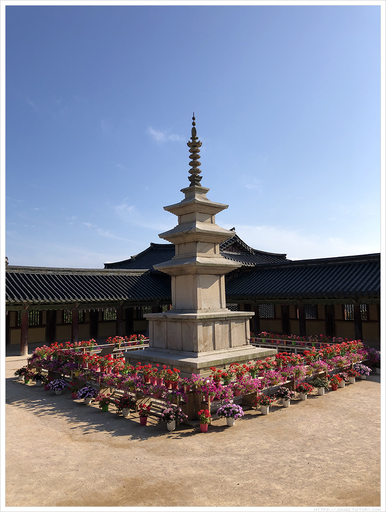 ▼ 대웅전 앞에 있는 탑 중 하나인 석가탑입니다. 보수를 끝낸 석가탑은 훨씬 깨끗하고 단정해졌습니다. 석가탑 뒤로 범영루가 보이는데 배경이 깔끔합니다. 그래서 석가탑이 더 돋보이는 것 같습니다. 범영루는 원래 범종이 있는 곳인데 지금은 법고(북)가 있는 곳입니다.