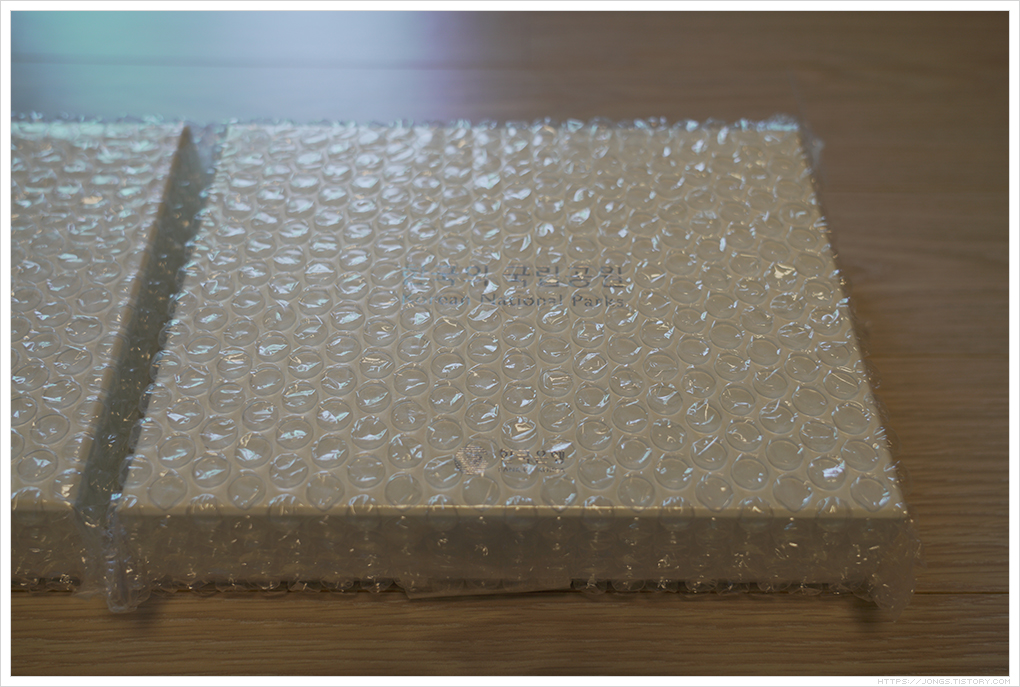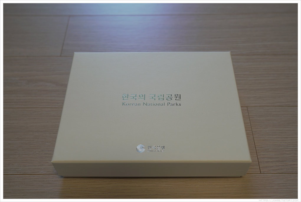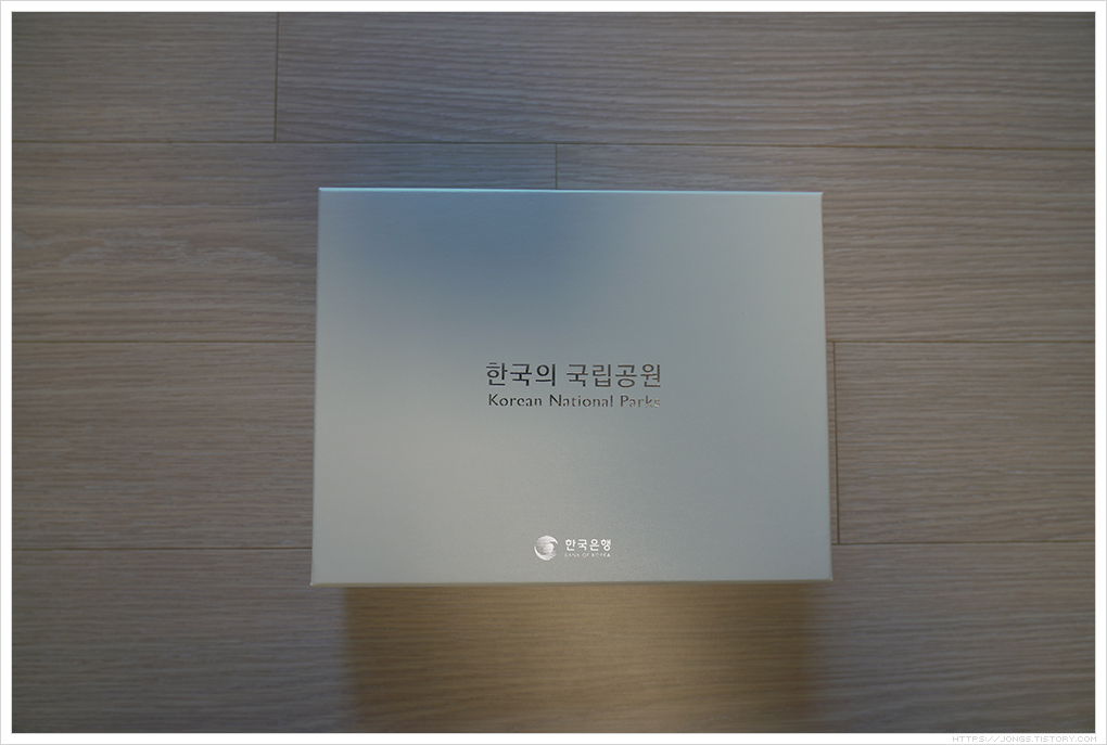 ▼ 겉은 하얀색의 박스에 은박의 음각 글자가 새겨져 있습니다. '한국의 국립공원(Korean National Parks)', '한국은행'이 써져 있습니다.