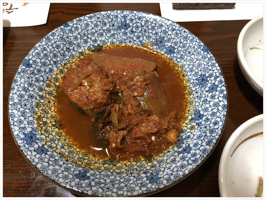 메뉴상 설명에는 “돼지고기 목살과 삼겹살을 10년 숙성시킨 된장으로 양념한 고기구이”라도 되어 있습니다. 고기는 정말 부드럽고 양념에서 깊은 맛이 느껴집니다.