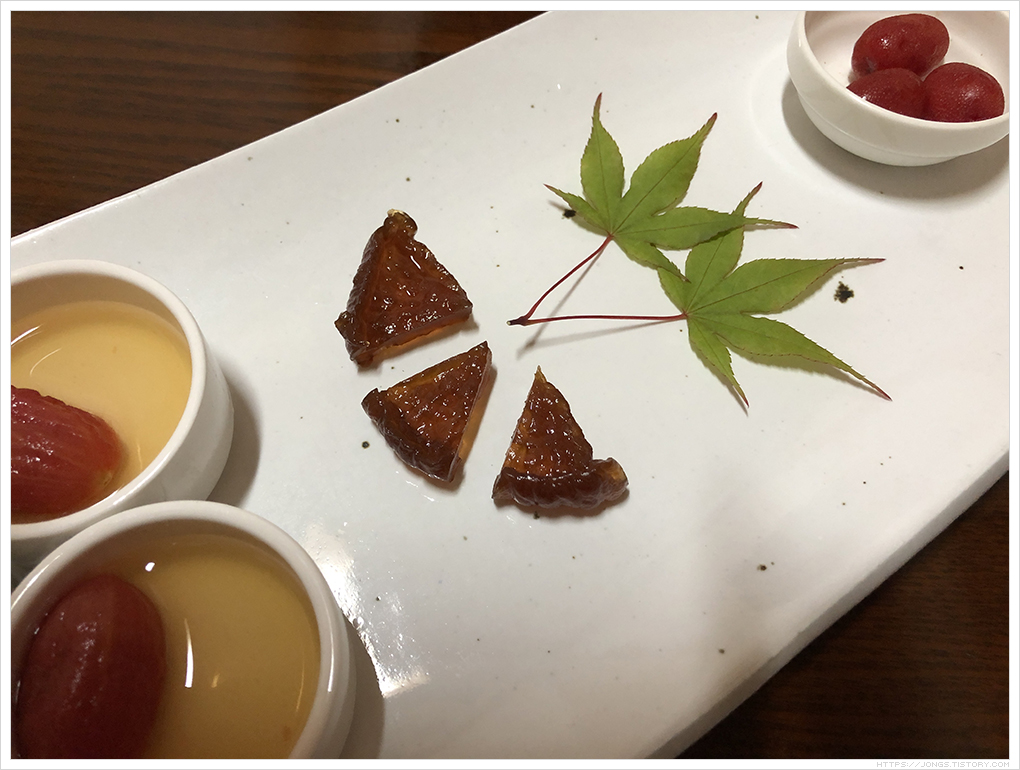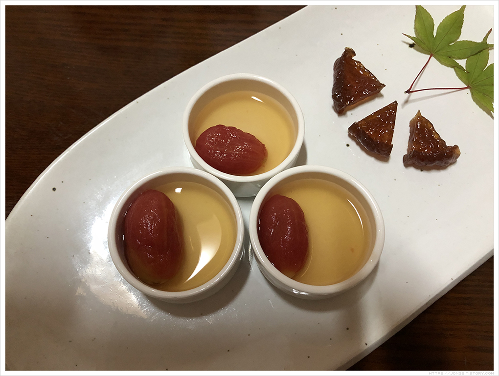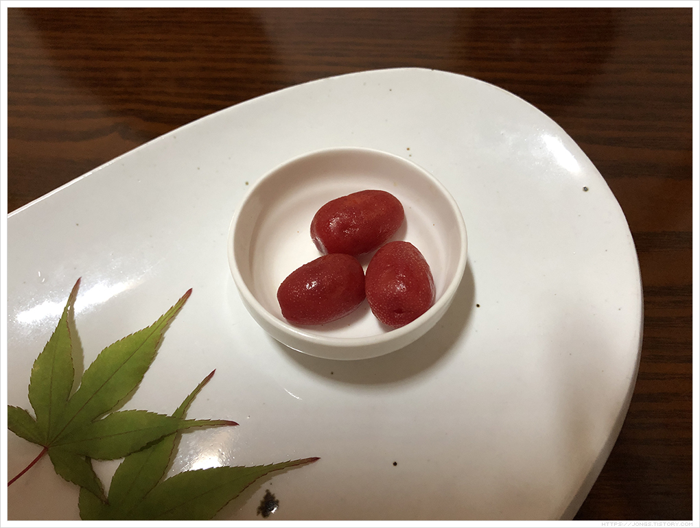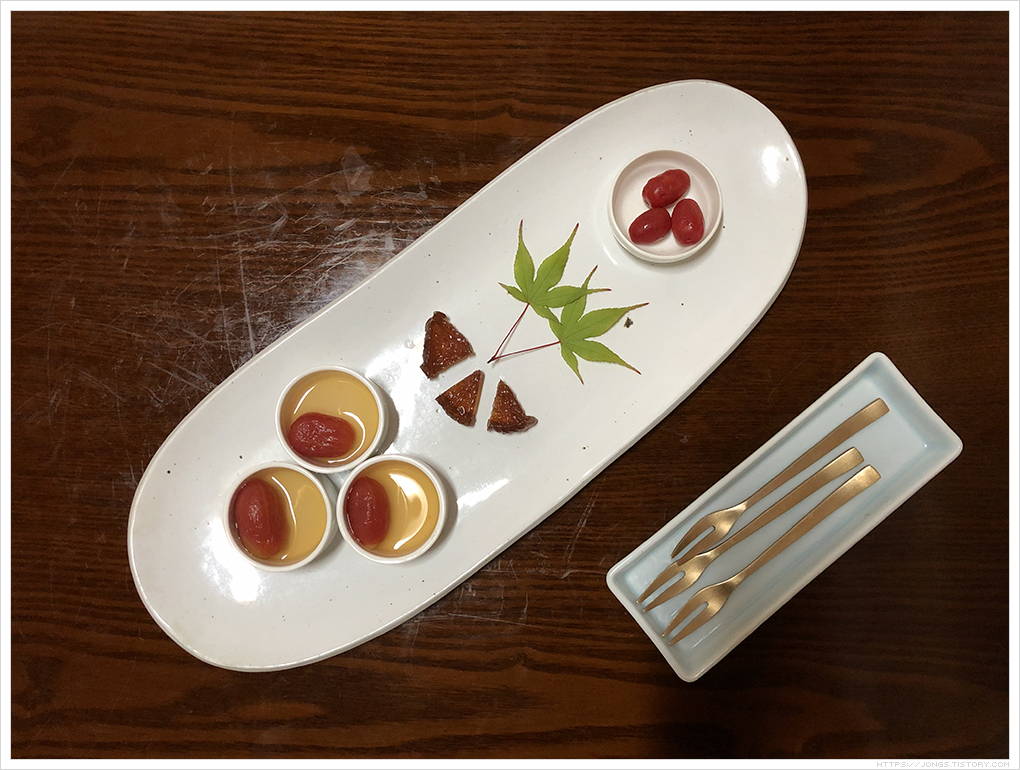 ▼ 마지막 메뉴인 후식입니다. 메뉴에는 “과일 한과 그리고 전통음료”라고 되어 있습니다. 왼쪽에 있는 것이 방울토마토 매실 절임, 정과, 보리수열매 입니다.