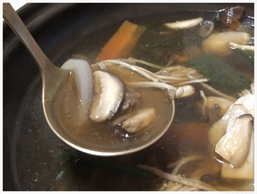 메뉴상 설명에는 “소 등심을 불고기 양념해 각종 버섯과 대파, 양파, 당근과 함께 다싯물과 10년 숙성시킨 조개간장으로 국물을 낸 전골”이라고 되어 있습니다. 소에서 나온 기름이 깔끔하다면 이상하지만 느끼하지 않았고 간장도 짜지 않으면서 과하지 않으면서 간이 딱 맞아 잘 되어 있더군요. 고기는 정말 부드러웠고 전골 국물에 흰쌀밥 말아서 먹고 싶었습니다. ^^