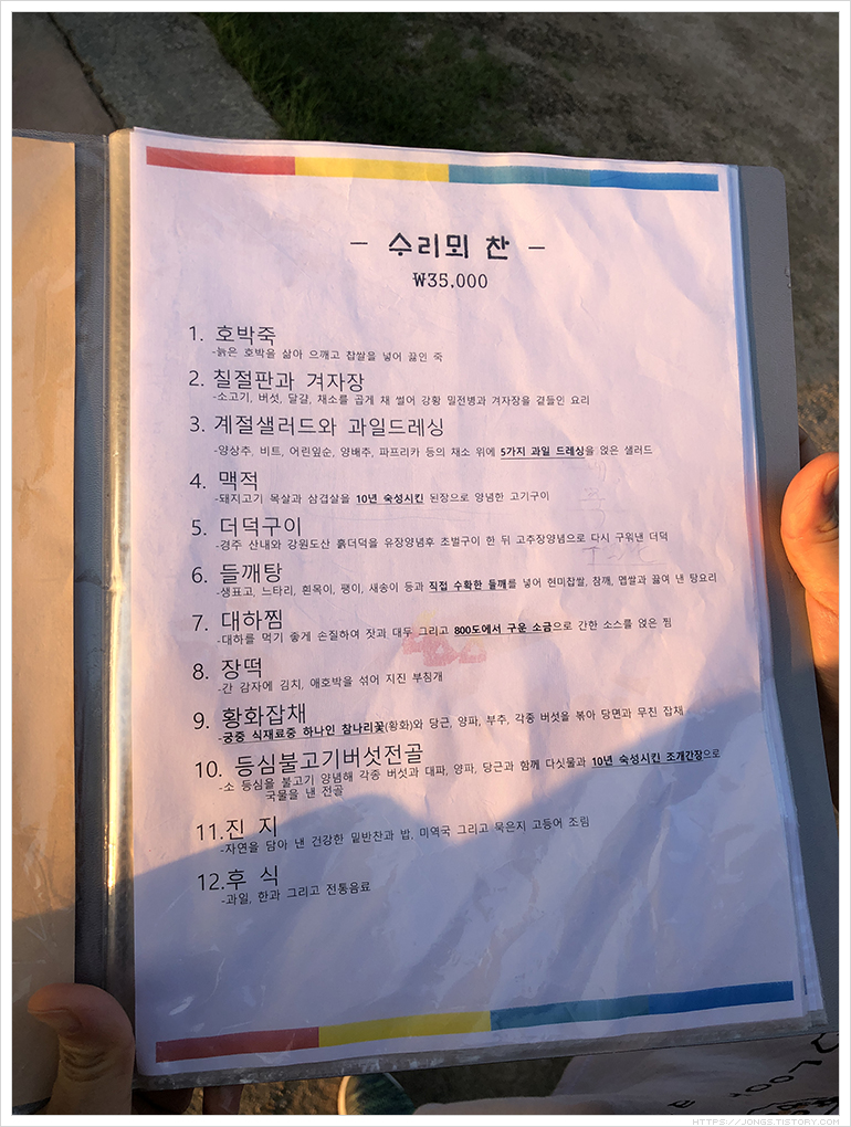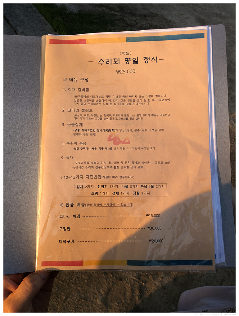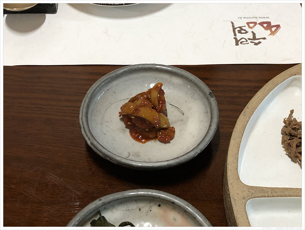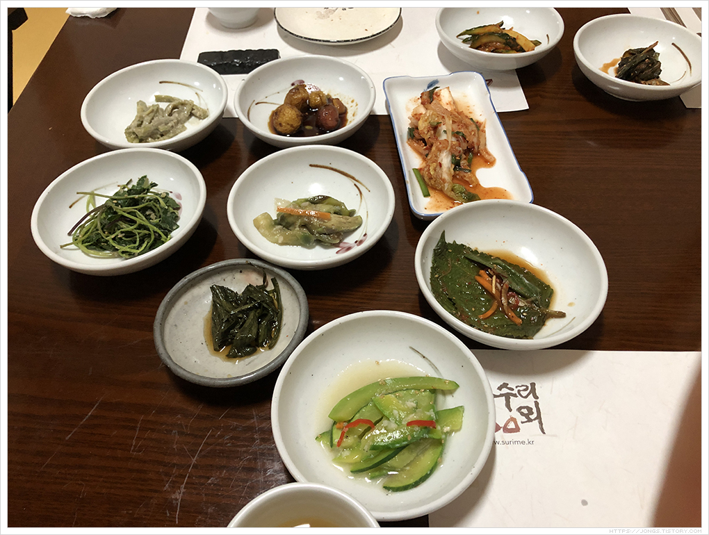 육고기 반찬 없이도 식물성 재료로 간이 딱 좋고 구성이 좋아 먹을 때 마다 만족하는 하동에 '무량원'이 생각이 났기 때문입니다. 수리뫼 '진지' 코스만 보면 '무량원'에서 먹은 반찬들이 눈에 아른거렸습니다.