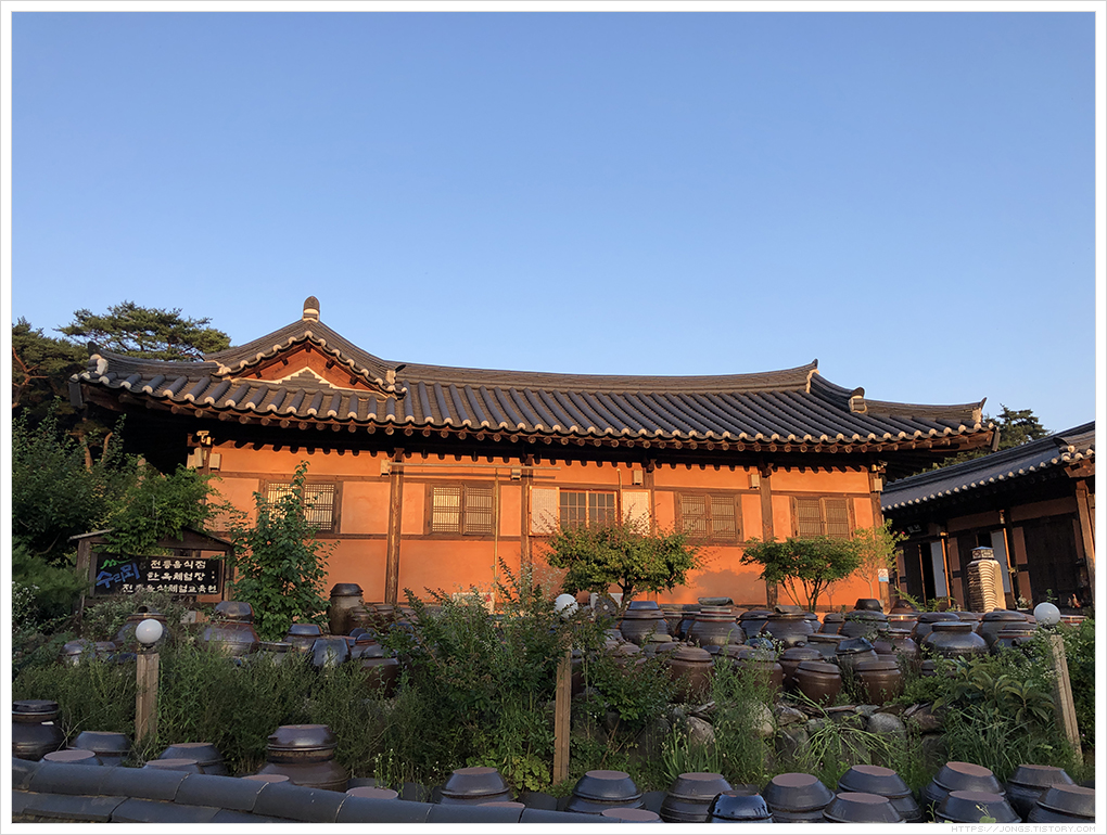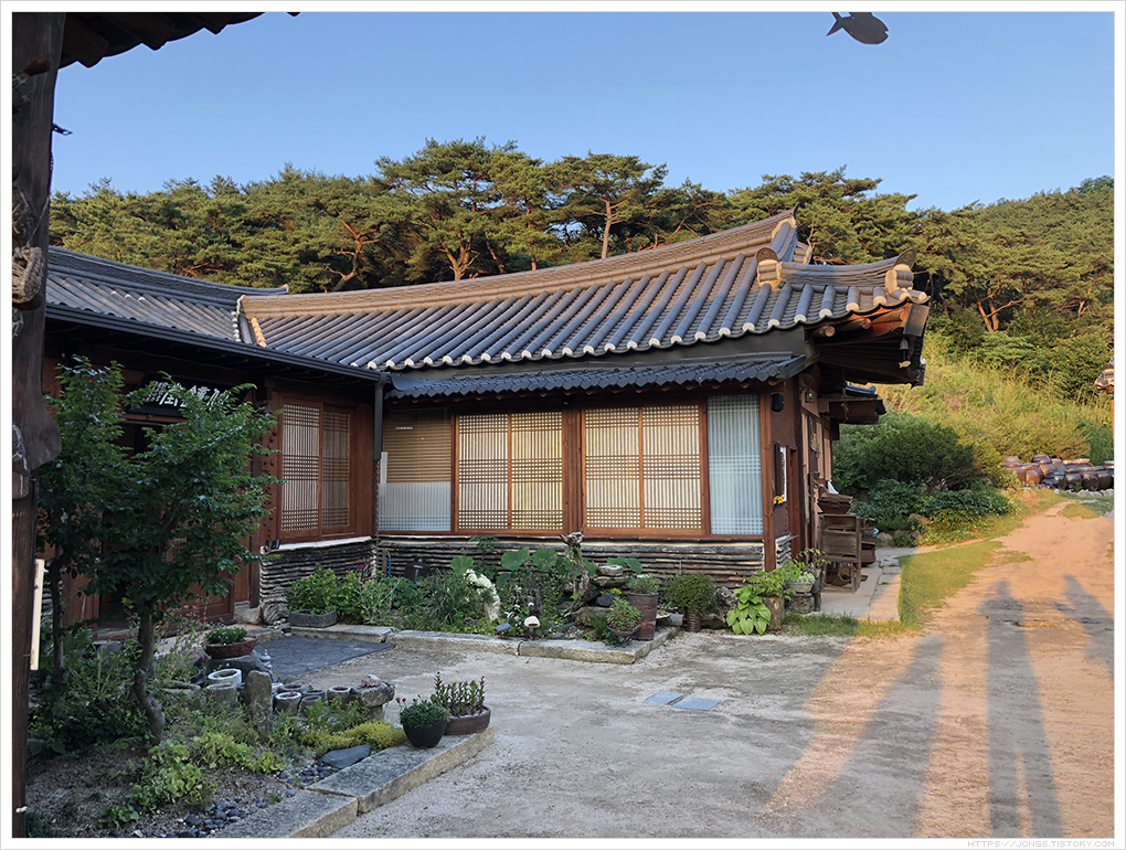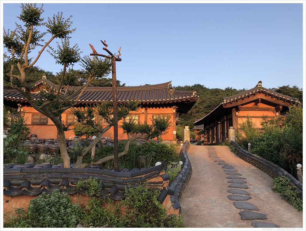 ▼ 한옥이 저녁 햇살을 받아 따뜻~해 보입니다. 들어가 보면 너무 편안하고 들어 누워 한숨 자고 싶을 정도입니다. 한옥이라 이런 느낌을 주는 것 같습니다. 올라가는 입구도 기와와 함께 황토를 섞어 만들어 전통적인 분위기를 한껏 느낄 수 있습니다.