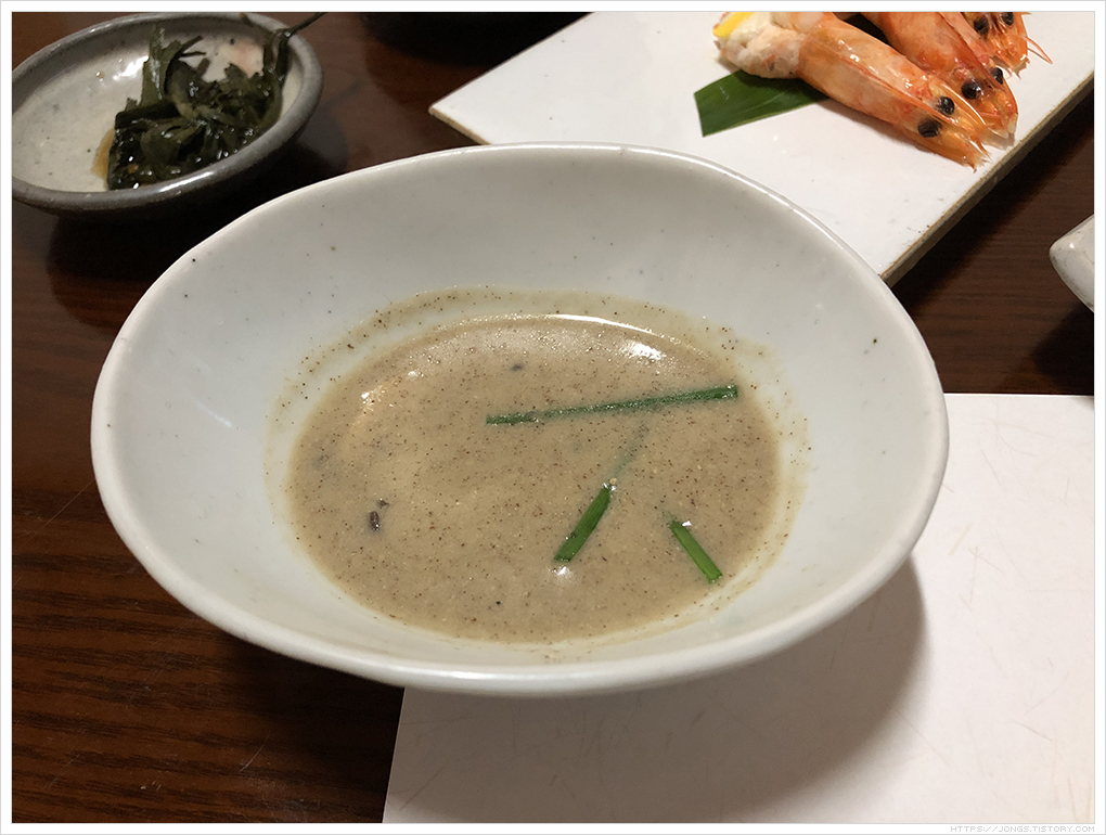 원래는 장떡이 나와야 되는데 재료사정에 따라 조금씩 바뀌게 됩니다. 개인적으로는 나쁘지 않았습니다. 메뉴상 설명에는 대하찜은 “대하를 먹기 좋게 손질하여 잣과 대두 그리고 800도에서 구운 소금으로 간한 소스를 얹은 찜”, 들깨탕은 “생표고, 느타리, 횐목이, 팽이, 새송이 등과 직접 수확한 들깨를 넣어 현미찹쌀, 참깨, 맵쌀과 끓여 낸 탕요리”, 장떡은 “긴 감자에 김치, 애호박을 섞어 지진 부침개”라고 되어 있습니다. 음식 하나하나가 정말 정성 가득한 느낌이 듭니다. 대하찜 비주얼이 정말 예술이지 않습니까? 살이 싹 발라지며 정말 부드러웠습니다.