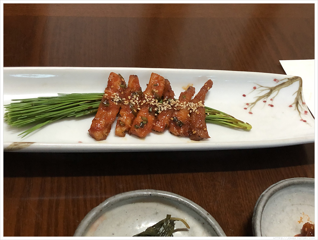 메뉴상에는 “경주 산내와 강원도산 흙더덕을 유장양념후 초벌구이 한 뒤 고추장양념으로 다시 구워낸 더덕”이라고 되어 있습니다. 맵지 않고 더덕이 부드러웠습니다.