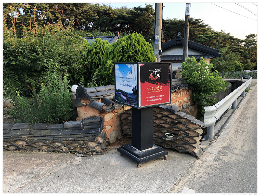 ▼ 수리뫼 간판입니다. 한국음식전문점이라고 써 있으며 경주 최부잣집 문중 서원인 용산서원 포사동에서 사전 예약시 숙박할 수 있다고 합니다. 300년이 된 한옥이라고 합니다.