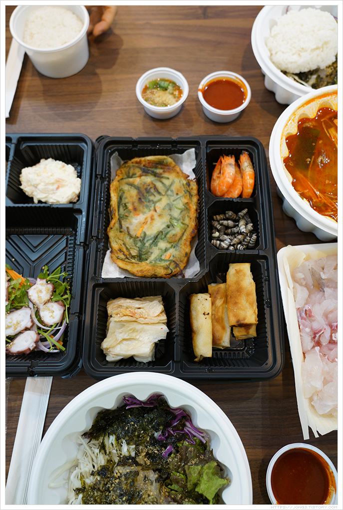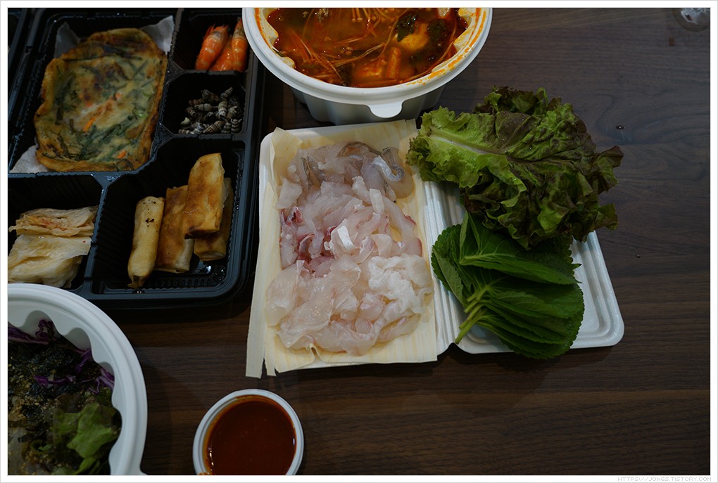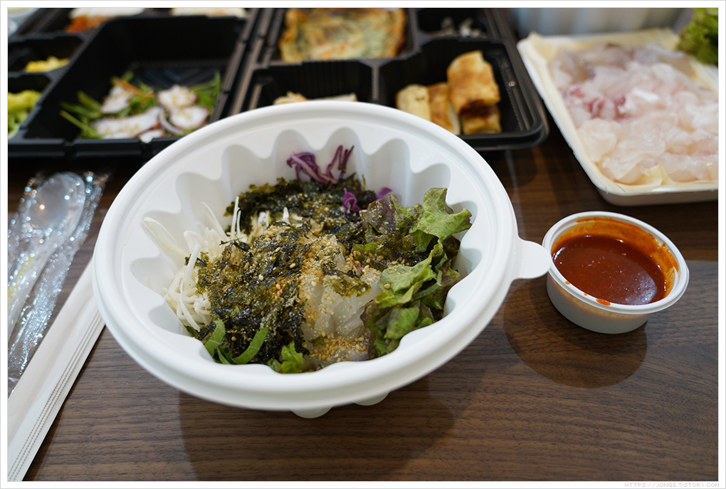 ▼ 회덮밥 3인분과 모듬회입니다. 매운탕은 회덮밥과 함께 나옵니다. 이 매운탕이 정말 진국입니다. 포장이라 매운탕을 데워 주실수 있는지 이야기 하면 가지고 와서 바로 먹을 수 있도록 따뜻하게 가열해 주십니다. 반찬도 정갈하고 맛 있어요.