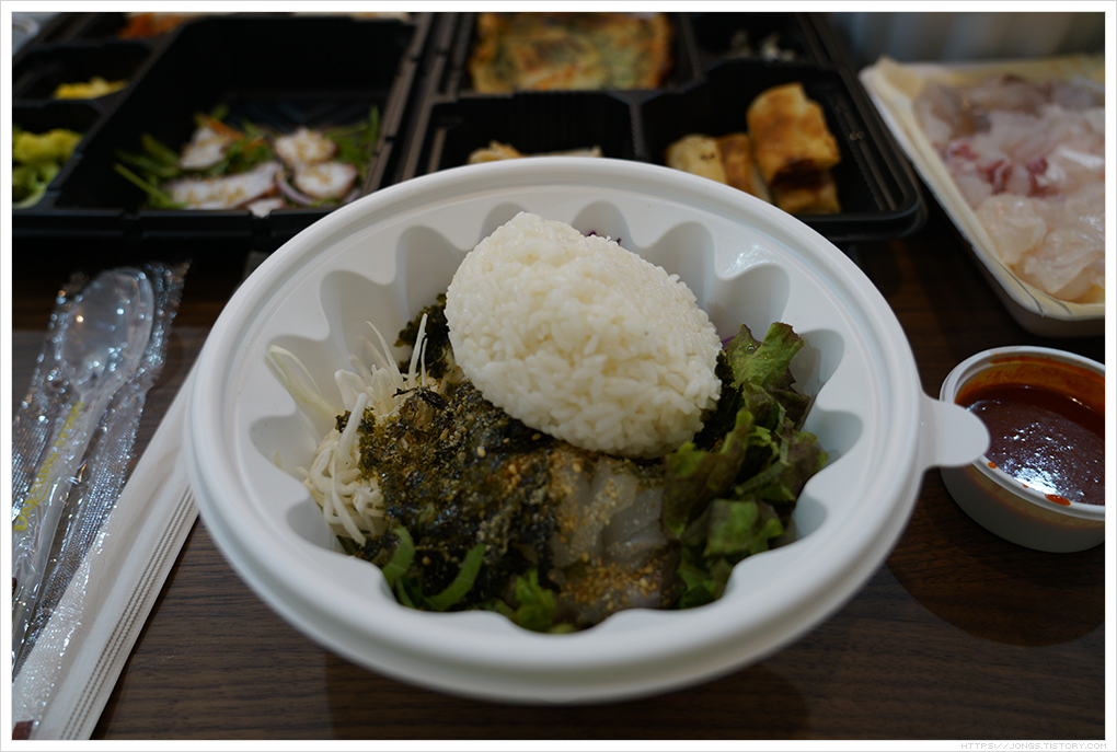 ▼ 회덮밥은 회도 푸짐하고 야채도 많은데 김도 많이 뿌려져 있습니다. 일단 깔끔하고 먹음직스럽습니다.