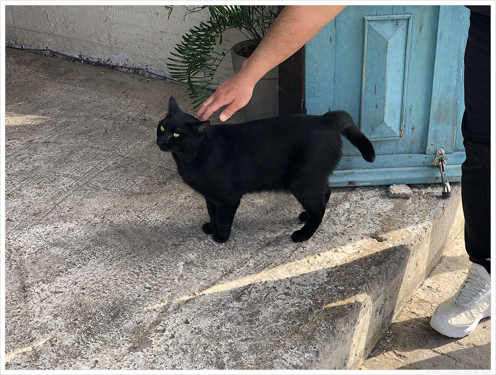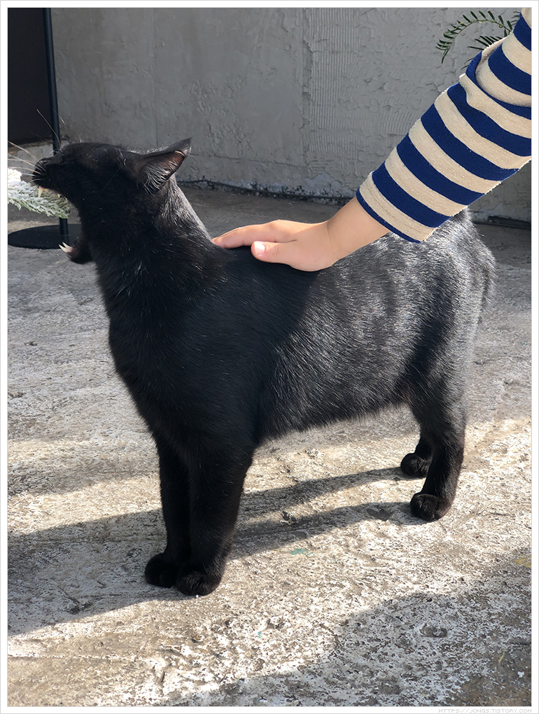 ▼ 커피 기다리는 동안 어디선가 나타난 검정 고양이. 손님들이 관심을 한몸에 받았는데 만져도 거부하지 않으면서 홉히워크룸 커피를 구매하게 만드는 영업사원 같은 느낌이더군요. 사람들의 사랑을 한 두번 받은 고양이가 아니더라구요.
